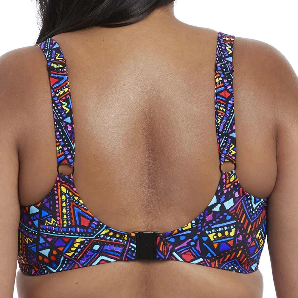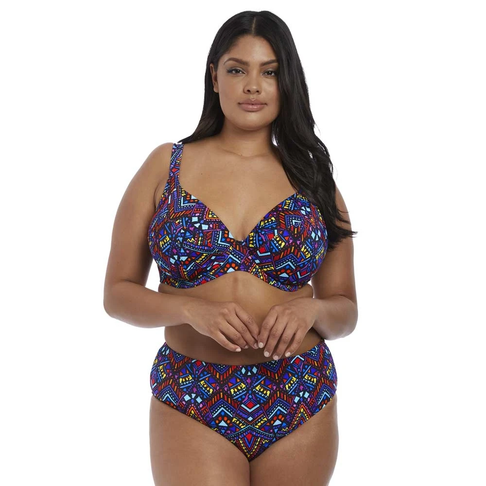 Aztec underwired plunge bikini top by Elomi Swim. Comes with fully lined three sectioned cups with side panle for support and uplift. The center is slightly lower for less coverage and to provide a plunge look. Features fully adjustable straps and strong powernet back lining for a smooth finish. Beautiful bikini with a geometric, colourful print all over perfect for fuller figure and fuller bust ladies. Limited stock left of this best seller, buy now.