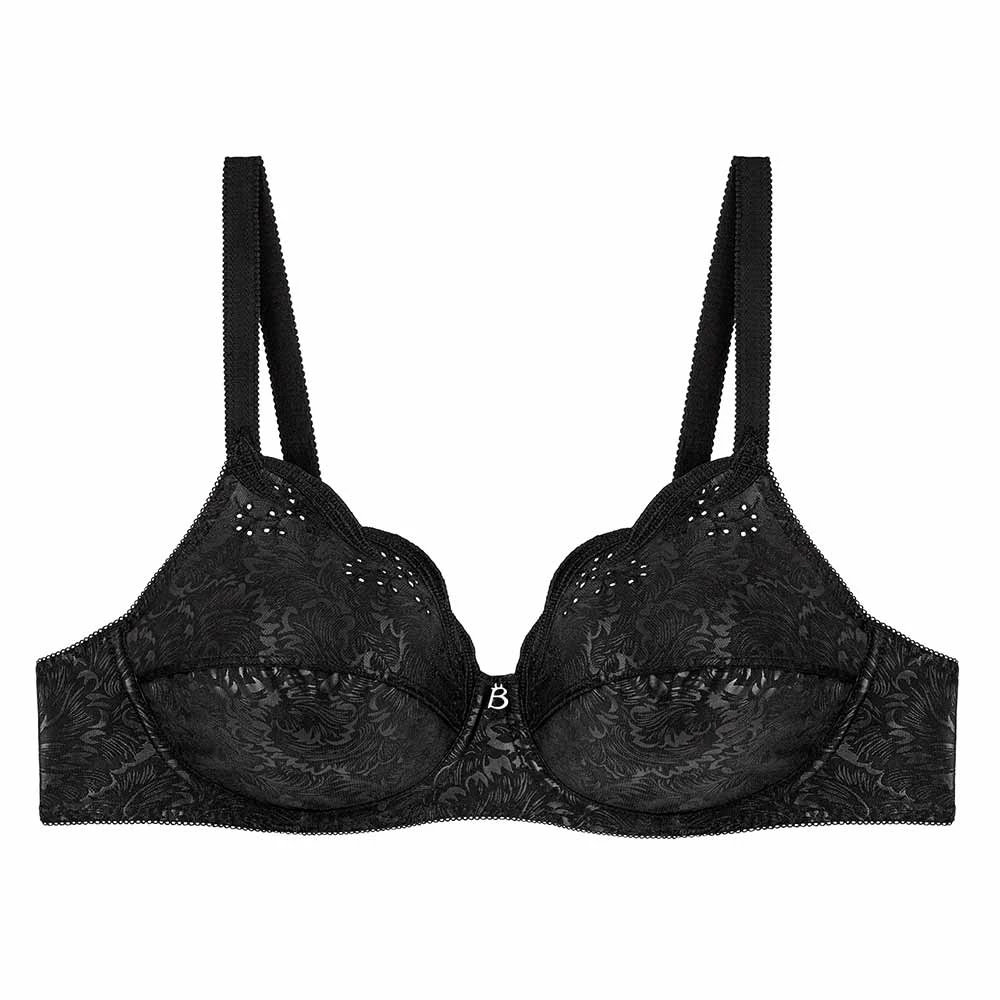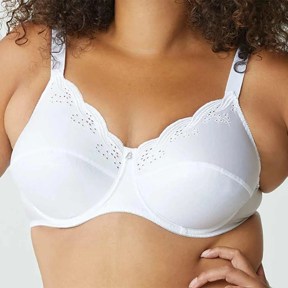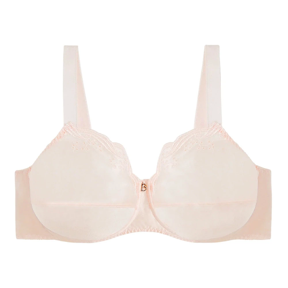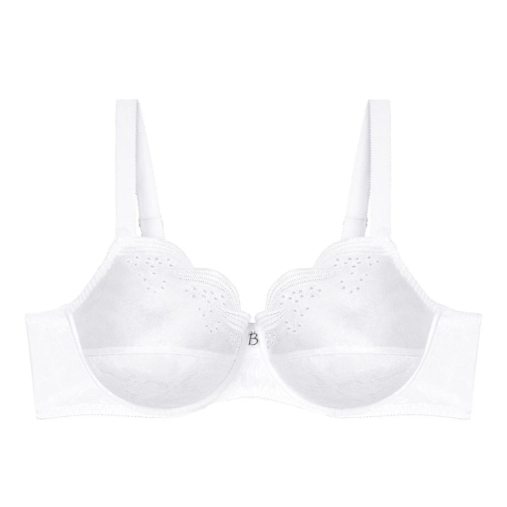 Emily Underwired Full Cup Bra by Bestform. Classic shape two section full coverage bra made from weave texture non-strech fabric for a firm fit. Decorated with delicate embroidery on the top cup to add to the elegant look.
