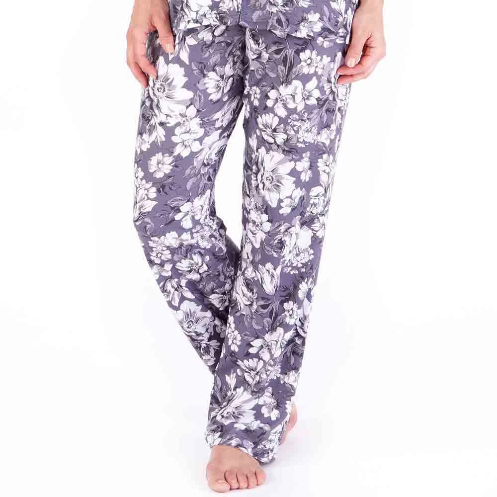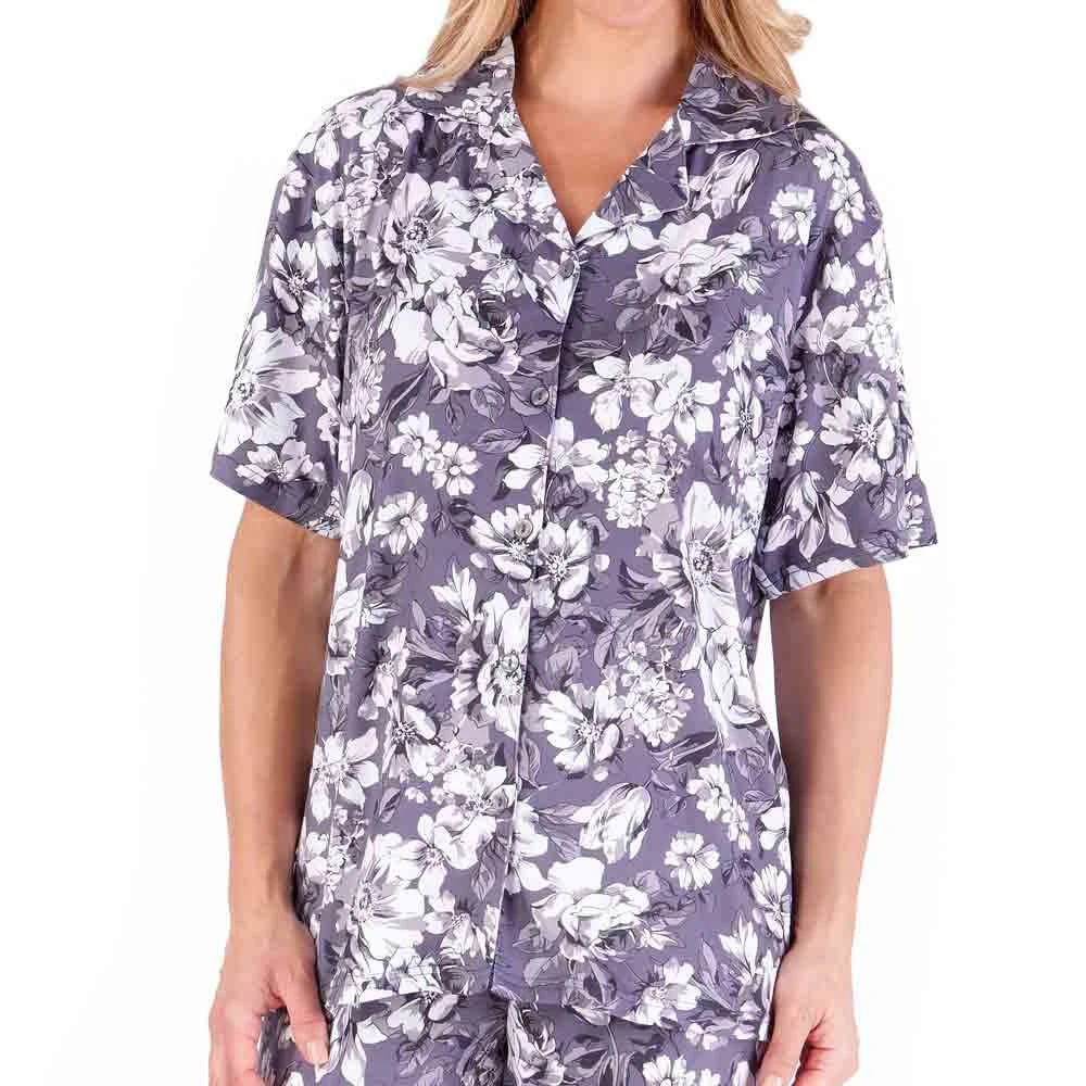 Bold Floral short sleeve pyjama set by Gaspe. Ladies summer pyjamas made from light and soft fabric in all over floral print. With button through short sleeve top and full length trousers for all night comfort.