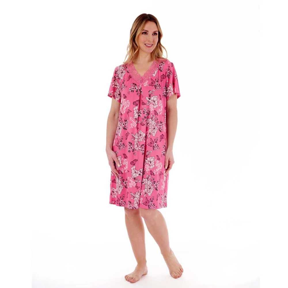 Butterfly short sleeve nightdress by Gaspe. Fashionable summer nightie made from soft fabrics in a refreshing all over print. decorated with delicate lace round the v-neck.