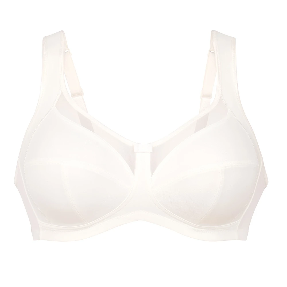 Non wired soft cups, Full coverage three sectioned cups with side panel for support, Adjustable comfort straps, V-shaped underband for comfort