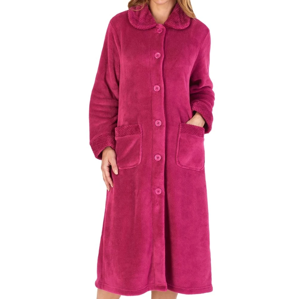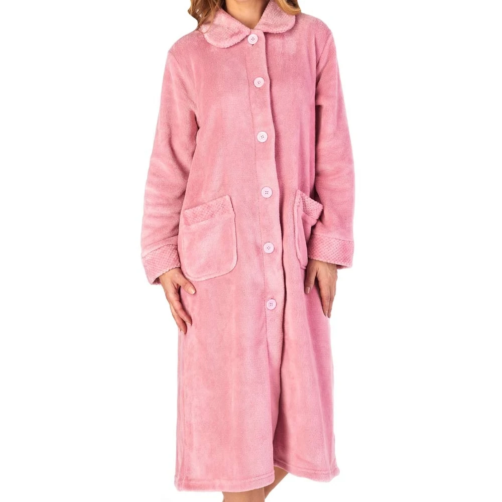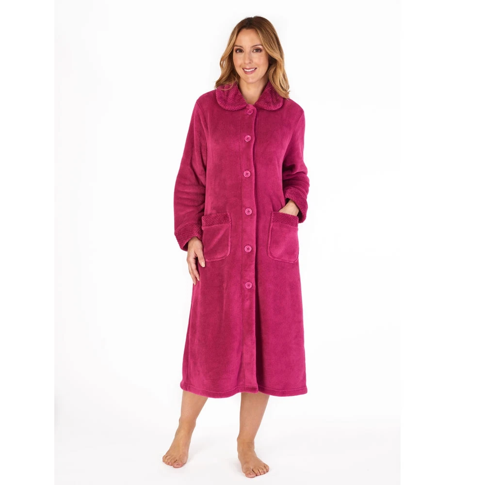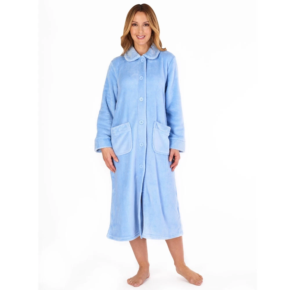 Classic button opening cosy housecoat by Slenderella. Warm and cuddly dressing gown with button through front for ease of wear; with long sleeves and peter pan collar finished with waffle detail for a luxury look. Made from high quality soft plush fabric to quickly warm you up on colder evenings and mornings. This housecoat comes with front pockets for convenience and colour matching buttons to add to the look. Practical every day extra layer perfect as a gift to the one you love.