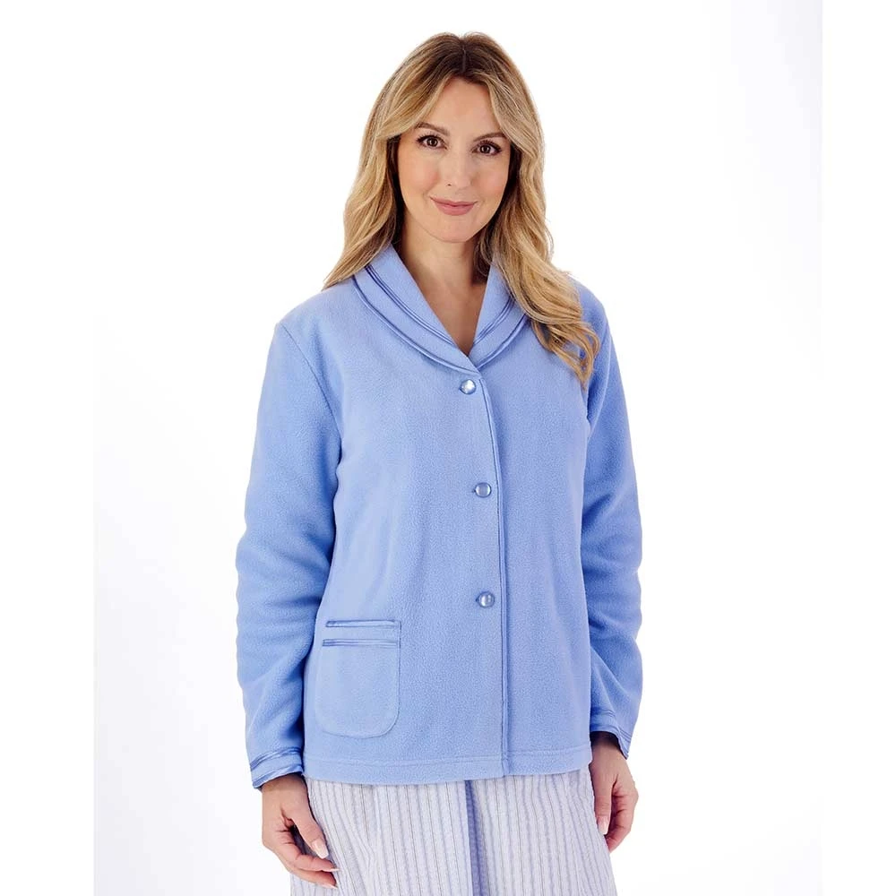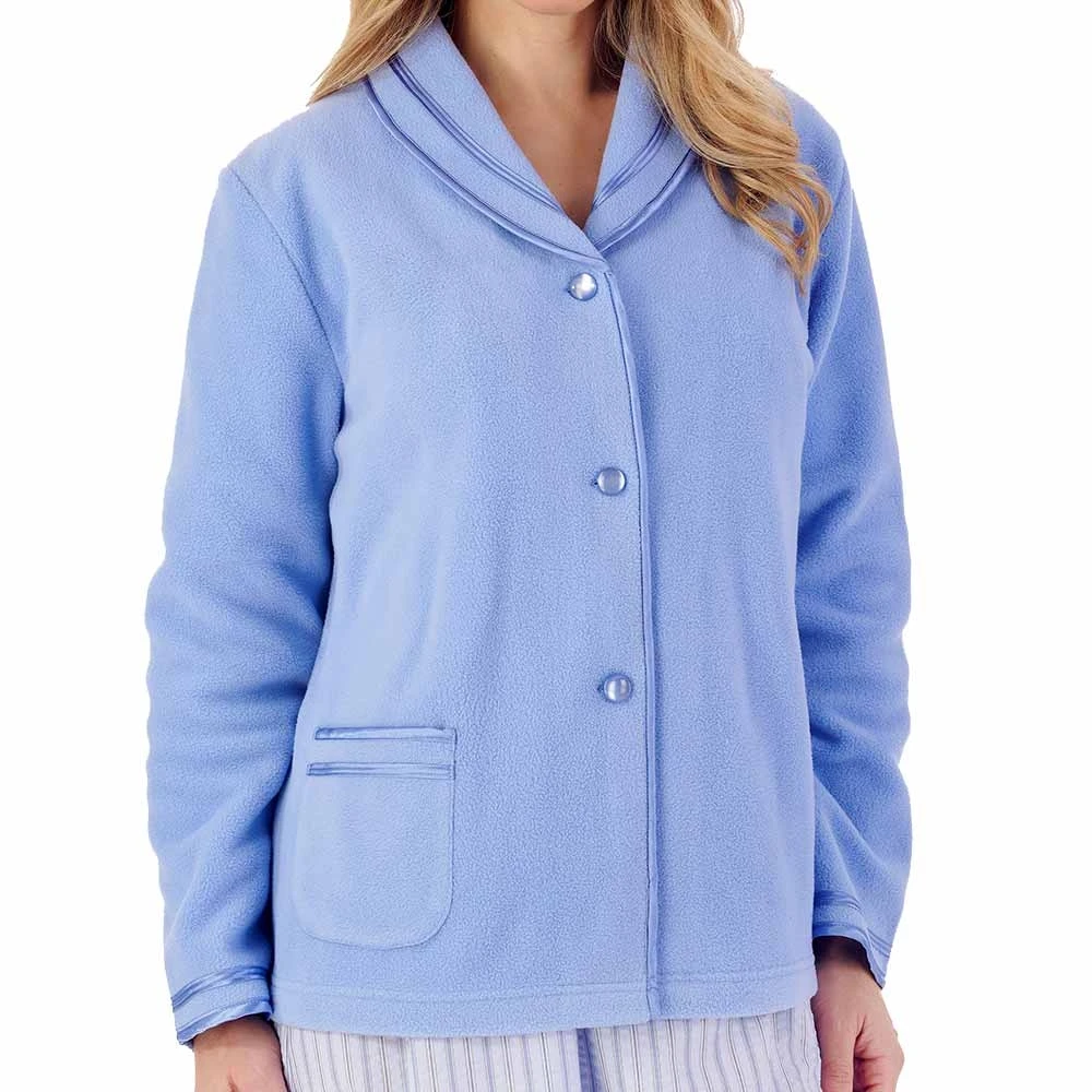 Cosy Fleece Buttoned Bedjacket by Slenderella. Classic design bedjacket with luxury satin trim round the edges and colour match buttons. With one functional pocket this is an essential winter layer when relaxing in bed. Stay warm and snug in this pretty button through, boucle fleece bed jacket. Machine washable at 40 degrees.