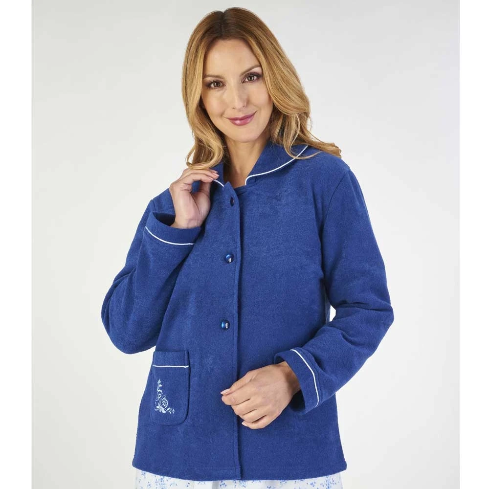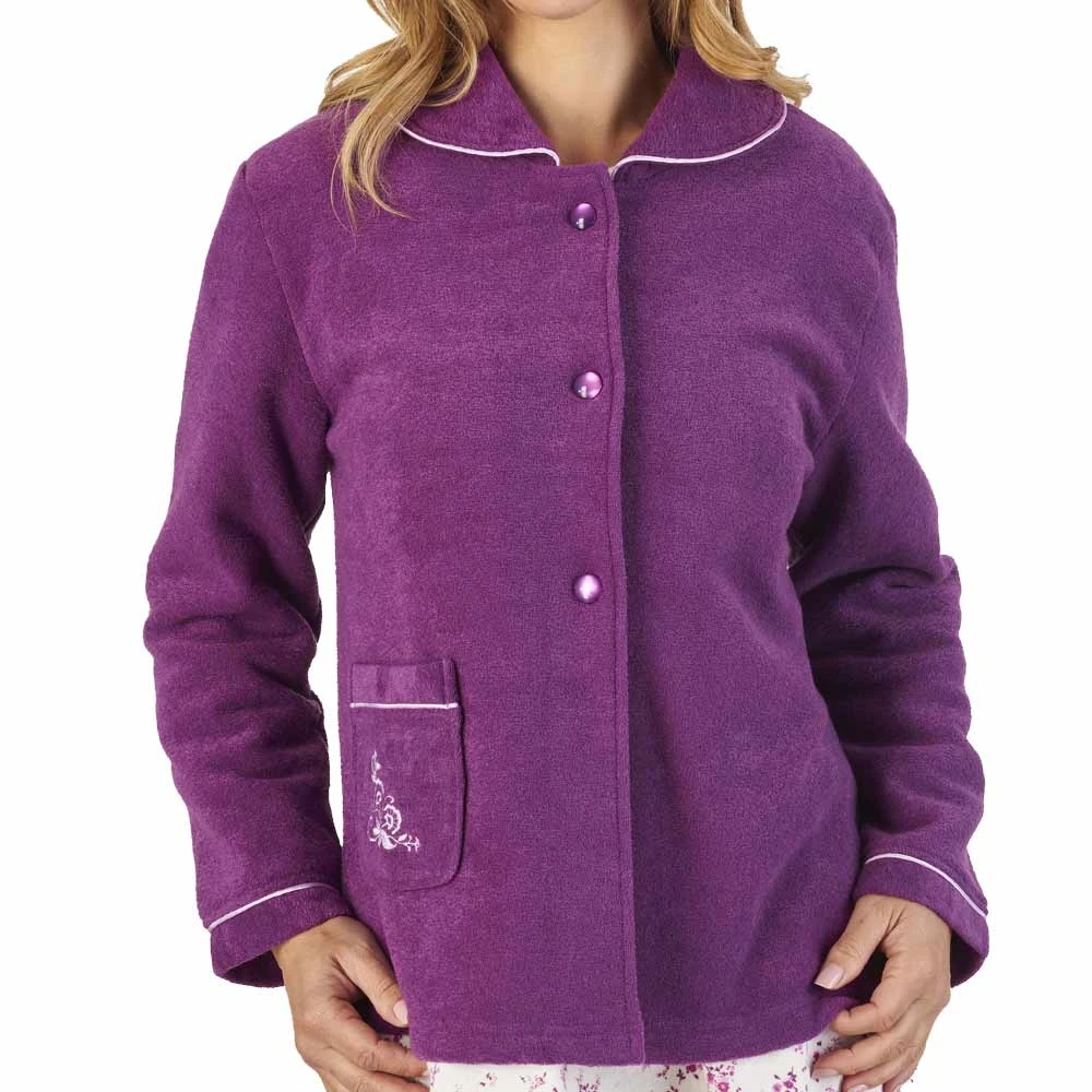Elegant button opening embroidered boucle fleece bedjacket by Slenderella. Long sleeve bed coat in a classic design with three buttons to the front and luxury satin trim finish round the collar and cuffs. Finished with pretty embroidery on the pocket to add to the look. Made from soft and warm towelling feel fabric to keep you warm at bed time without being heavy. Machine washable at 40 degrees. Perfect for bed reading or to lounge round the house as a short dressing gown. Will make a beautiful gift for the one you love.