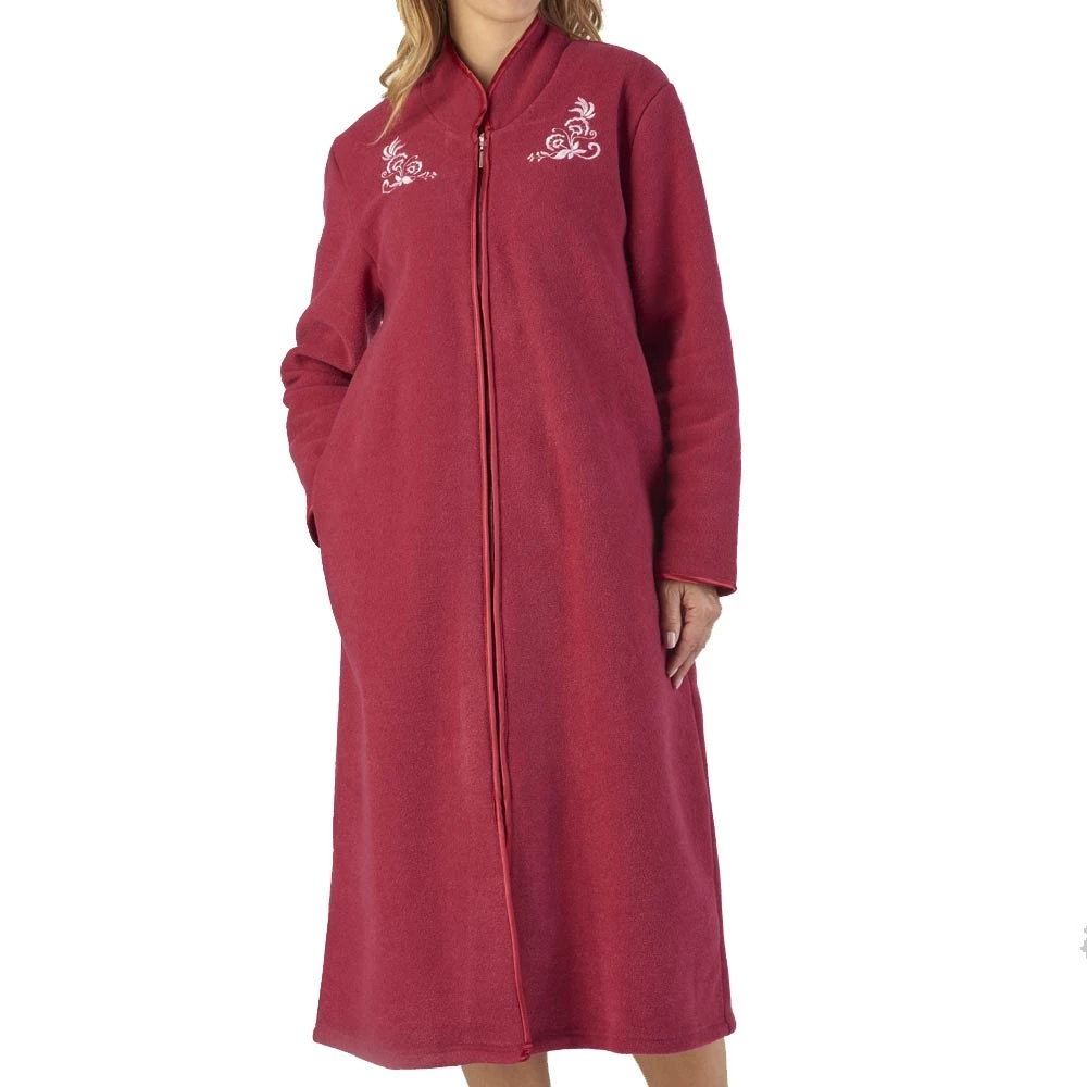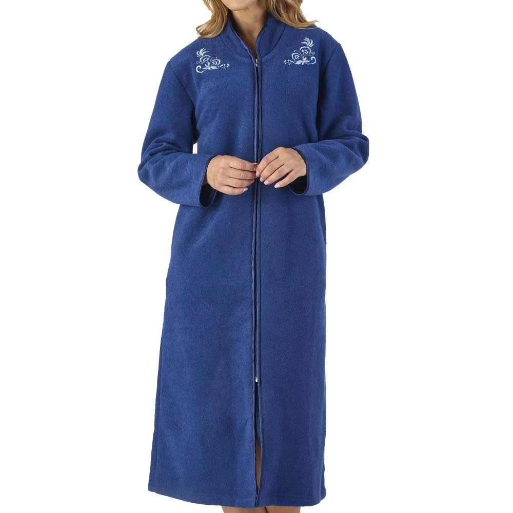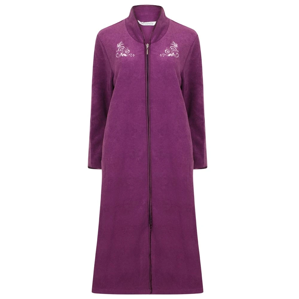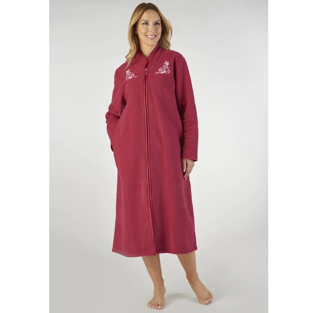 Elegant zip opening embroidered boucle fleece housecoat by Slenderella. Classic ladies dressing gown in a traditional shape for every age and body type. With luxury embroidery to the front and satin trim to the edges for a feminine look. Made from soft and warm fabric to keep you cosy at colder days.