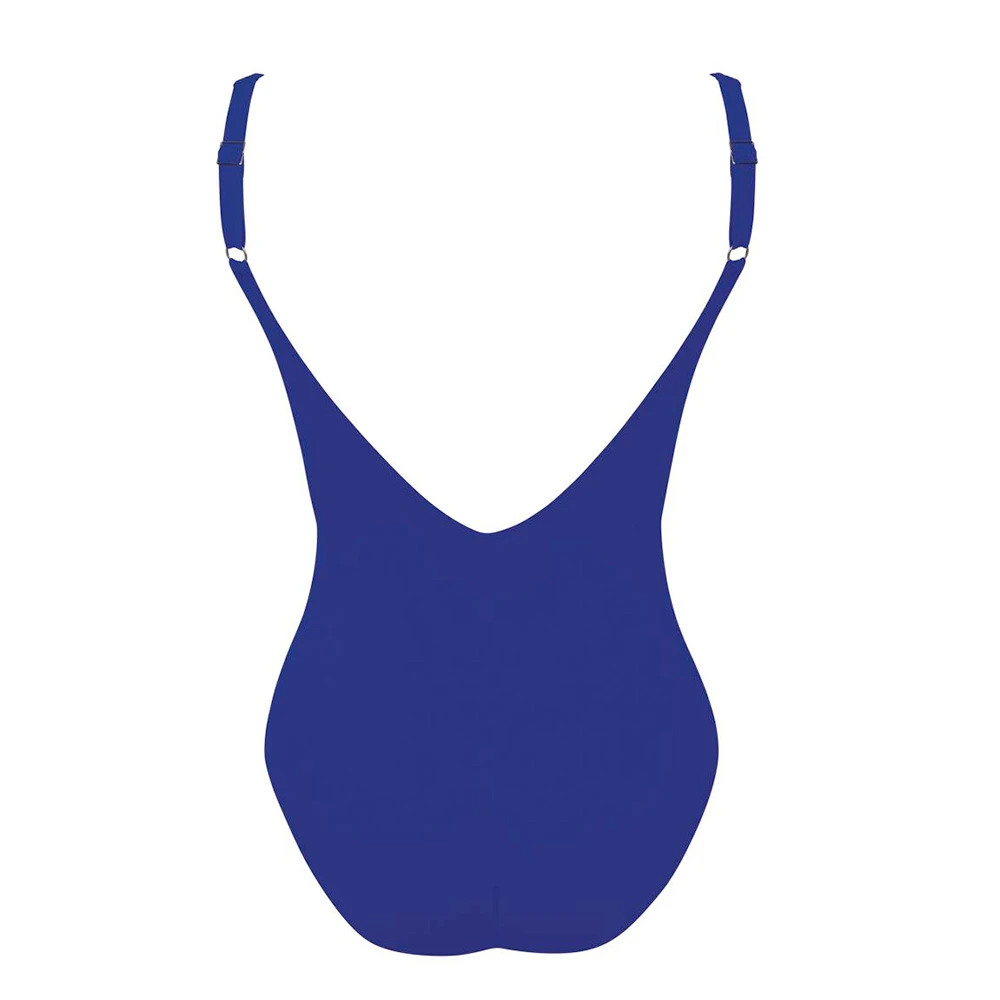 Soft cup swimming costume with powernet bust lining finished with elasticated band, Powernet wings on the back for a smooth finish, Zip fastener in the middle of the breast for a trendy look, Low cut rounded back for a ease of wear, Adjustable straps