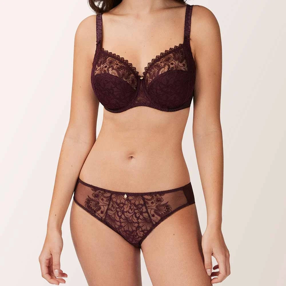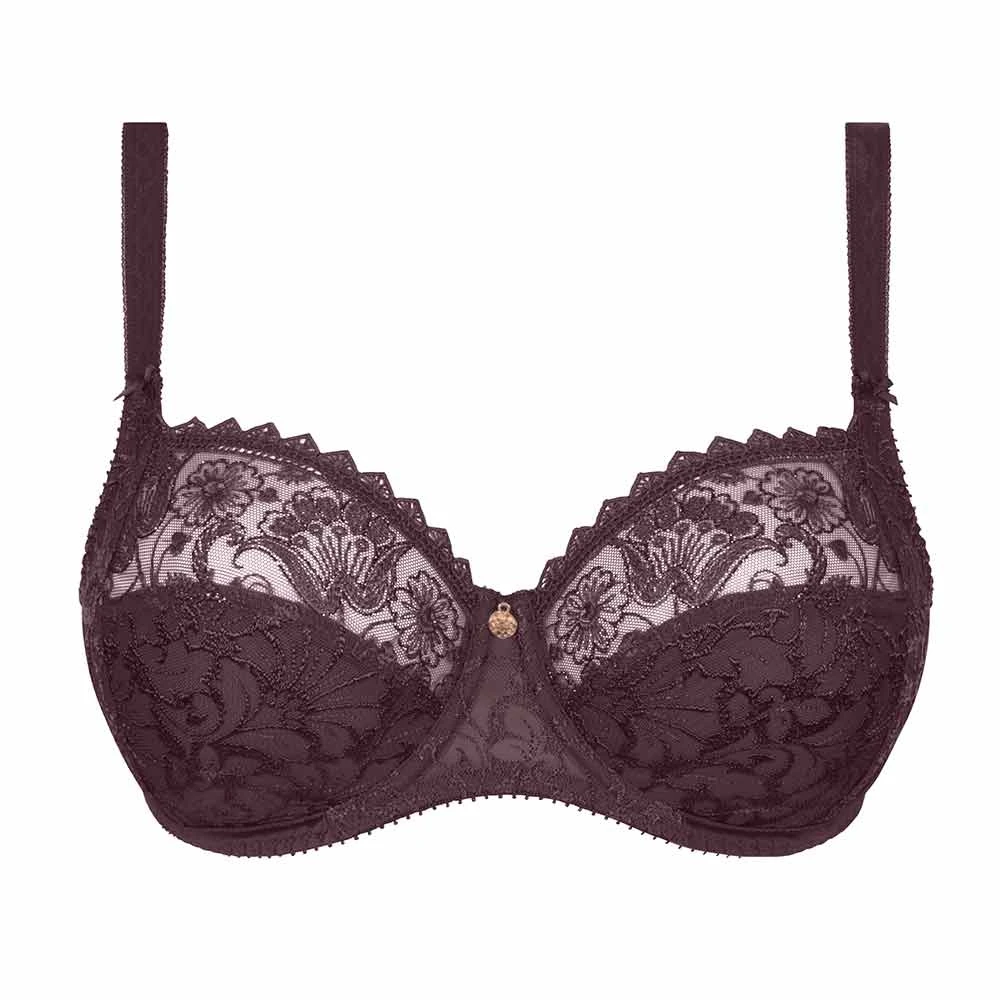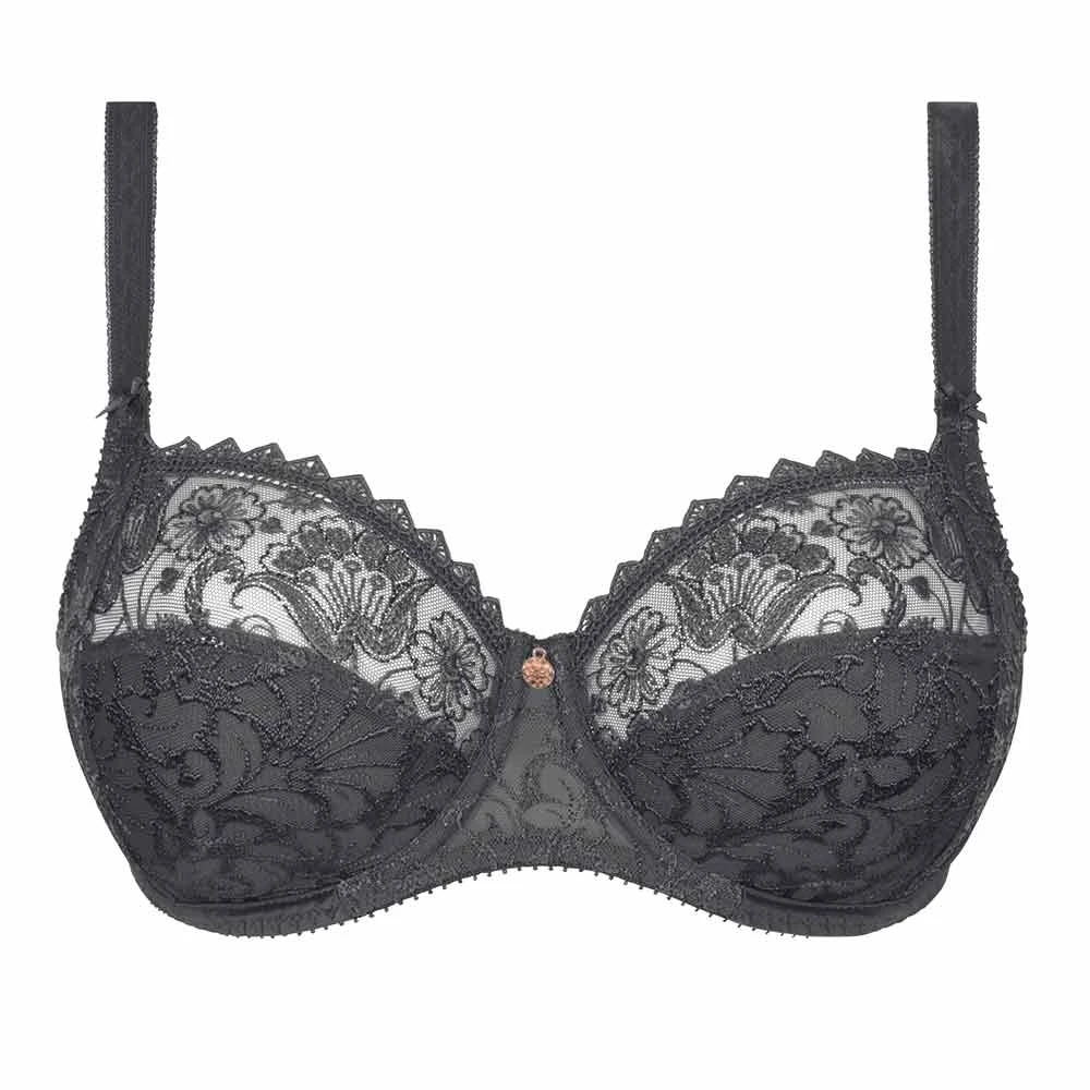 Josephine underwired full cup bra by Empreinte. Full coverage underwired bra with two section cups and wide side panel for support and forward shape. made from non stretchy tulle fabric decorated with delicate floral embroidery. The bottom cup is lined with soft, non stretchy fabric for an extra firmness. Josephine collection has been inspired by the splendour of the Empire with beautiful rich finishing on the edges and lurex threads on the top cup.