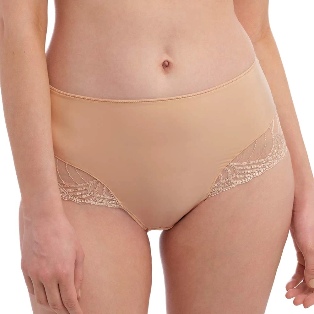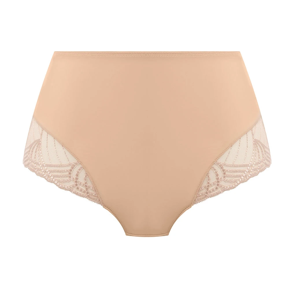 Adelle full briefs by Fantasie Lingerie. Full coverage ladies briefs made from soft to handle recycled fabric. Decorated with tulle inserts at front leg and finished with geometric style embroidery for a lighter look.