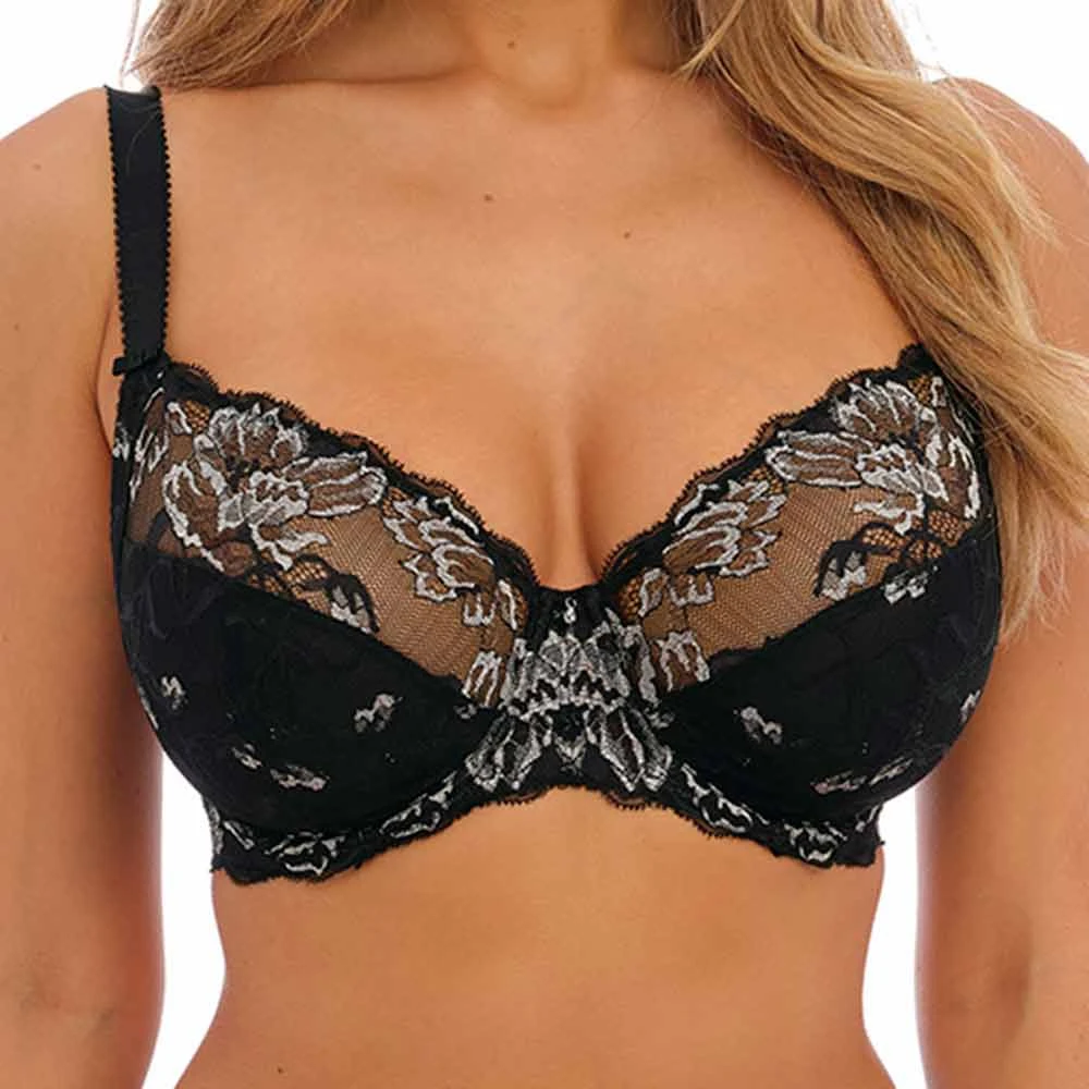 Aubree side support bra by Fantasie Lingerie. Underwired bra with three sectioned cups and side panel for support, uplift and forward shape; with lower centre front for plunge neckline. Made from two tone lace with floral design for a refreshing look. Aubree is a new Fantasie staple collection for everyday wear and unbeatable comfort.