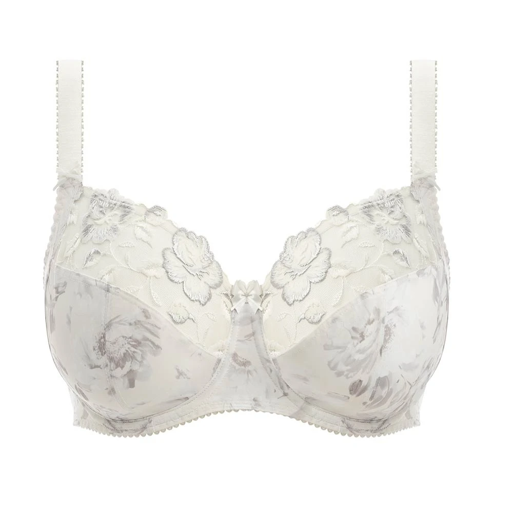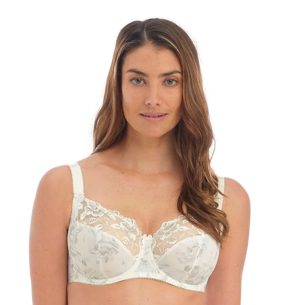 Caroline side support underwired bra by Fantasie Lingerie. Light and delicate underwired bra made from all over floral print fabric for a summer look. With full, three sectioned cups and wide side panel for forward projection and uplift. Finished with tulle top cup with two tone embroidery to add to the look.