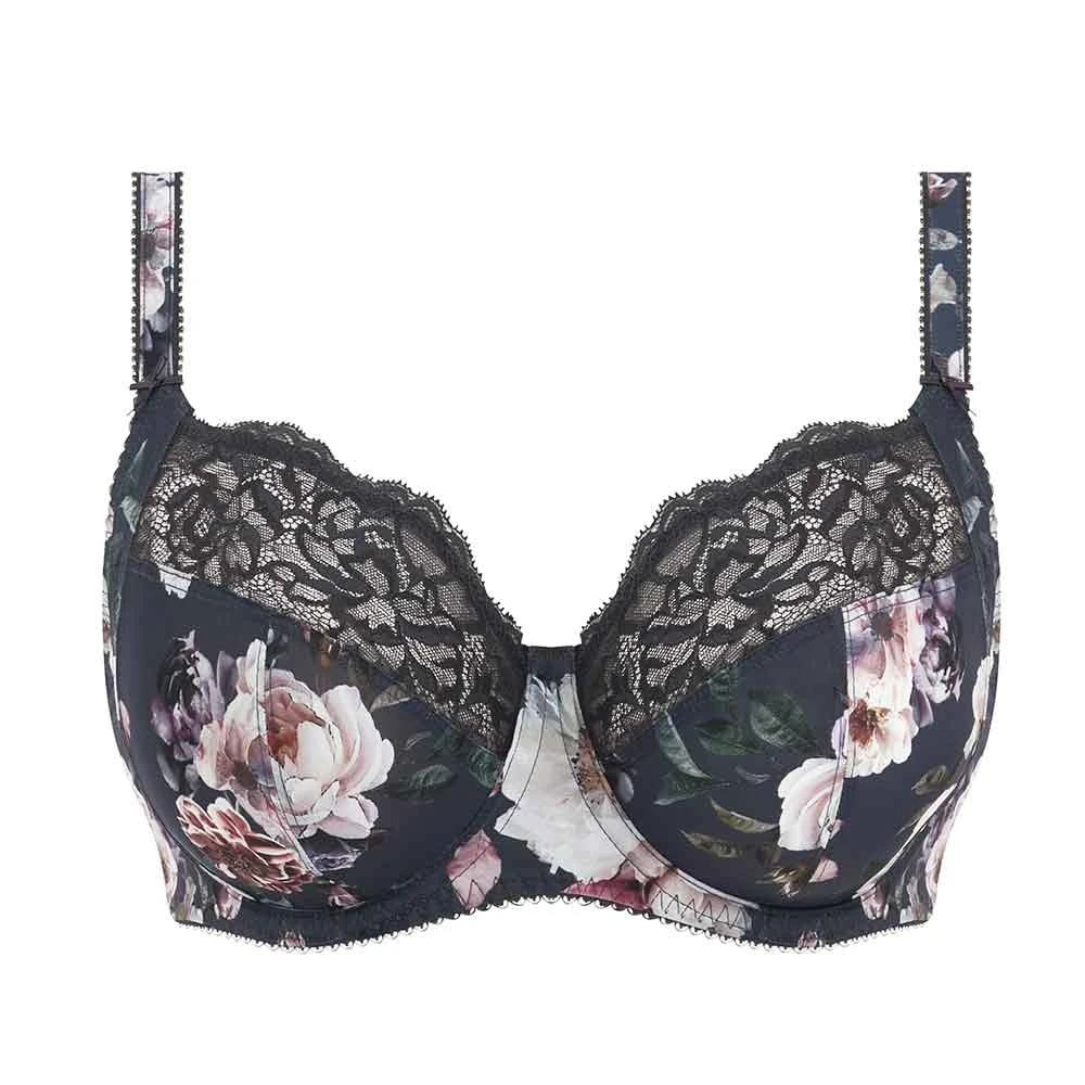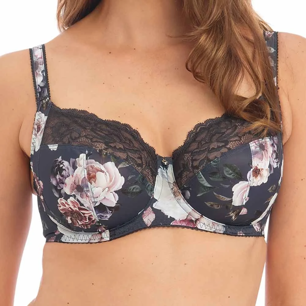 Pippa underwired side support bra by Fantasie Lingerie. Fuller bust bra with three sectioned cups and side panel for a good uplift and forward shape up to a J cup. Made from all over rose print fabrics and finished with a delicate lace on the the top cup. The top cup is lined for an additional support. Pippa collection with delicate pastel colours on the slate background is perfect for the Autumn season.