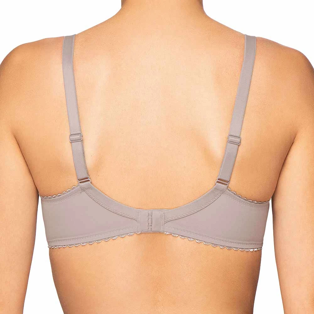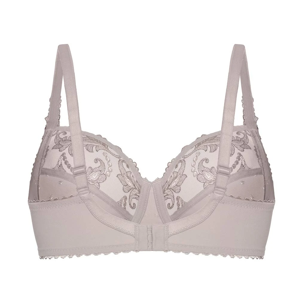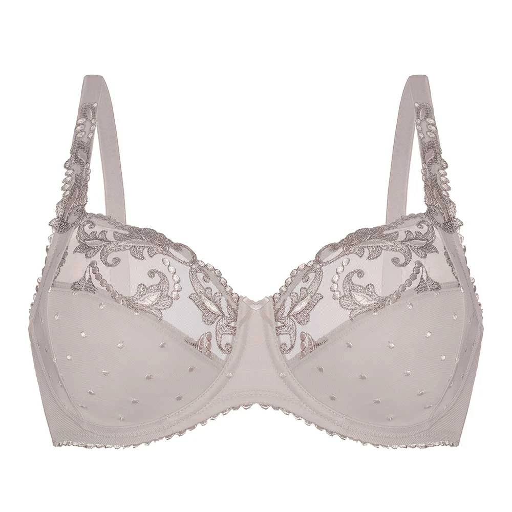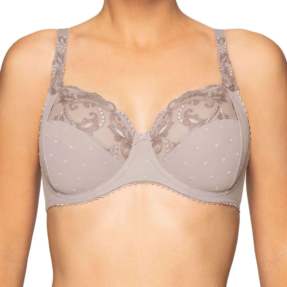 Secret Delight underwired support bra by Felina. Very feminine bra made from strong firm fabric; with three sectioned underwired cups including a wide side panel for forward shape. The top cup sheer panel is embroidered with delicate floral motifs which continue through the front strap. The cups are finished with tiny lighter tone dots for a softer look.