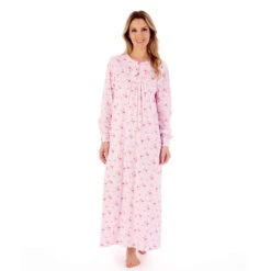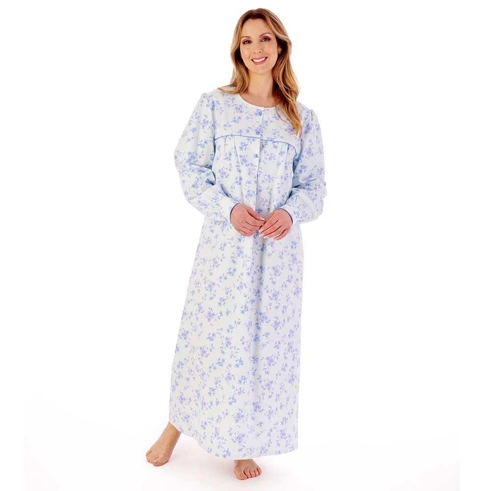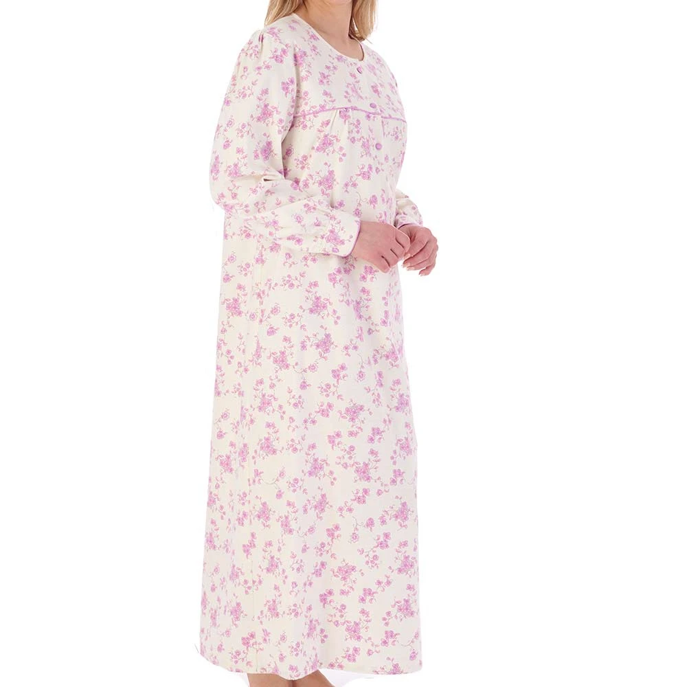 Floral Brushed Cotton Longer Length Round Neck 51 inch Nightdress by Slenderella. Ankle length ladies winter nightdress made from flannel thick cotton fabric for colder nights and evenings. In all over delicate floral design decorated with solid colour satin piping to the yoke and buttoned cuffs for an elegant, traditional look.