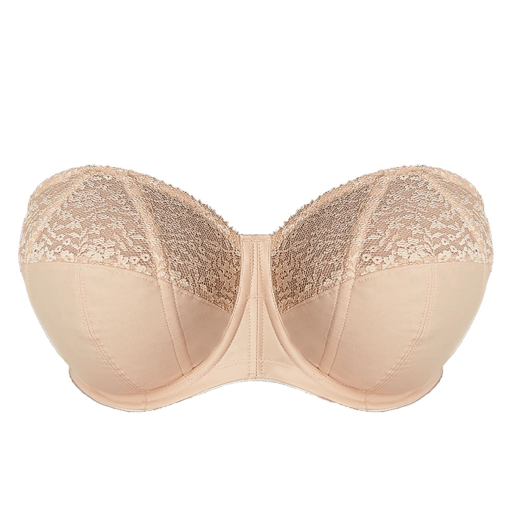 Adelaide plus size wired strapless bra – from the most popular Goddess collection. Fully lined bra cut from smooth matte simplex fabric with flat lace to the top. Comes with flexible flat metal bones in centre front and back to prevent rolling and to provide better uplift. Spiral bones at side seam prevent rolling and are angled to prevent digging in. Detachable narrow straps are attached. The straps can be connected in two different positions to the front to suit different dress necklines. Thanks to the new shape this is one of the best selling strapless bras for fuller busted ladies.