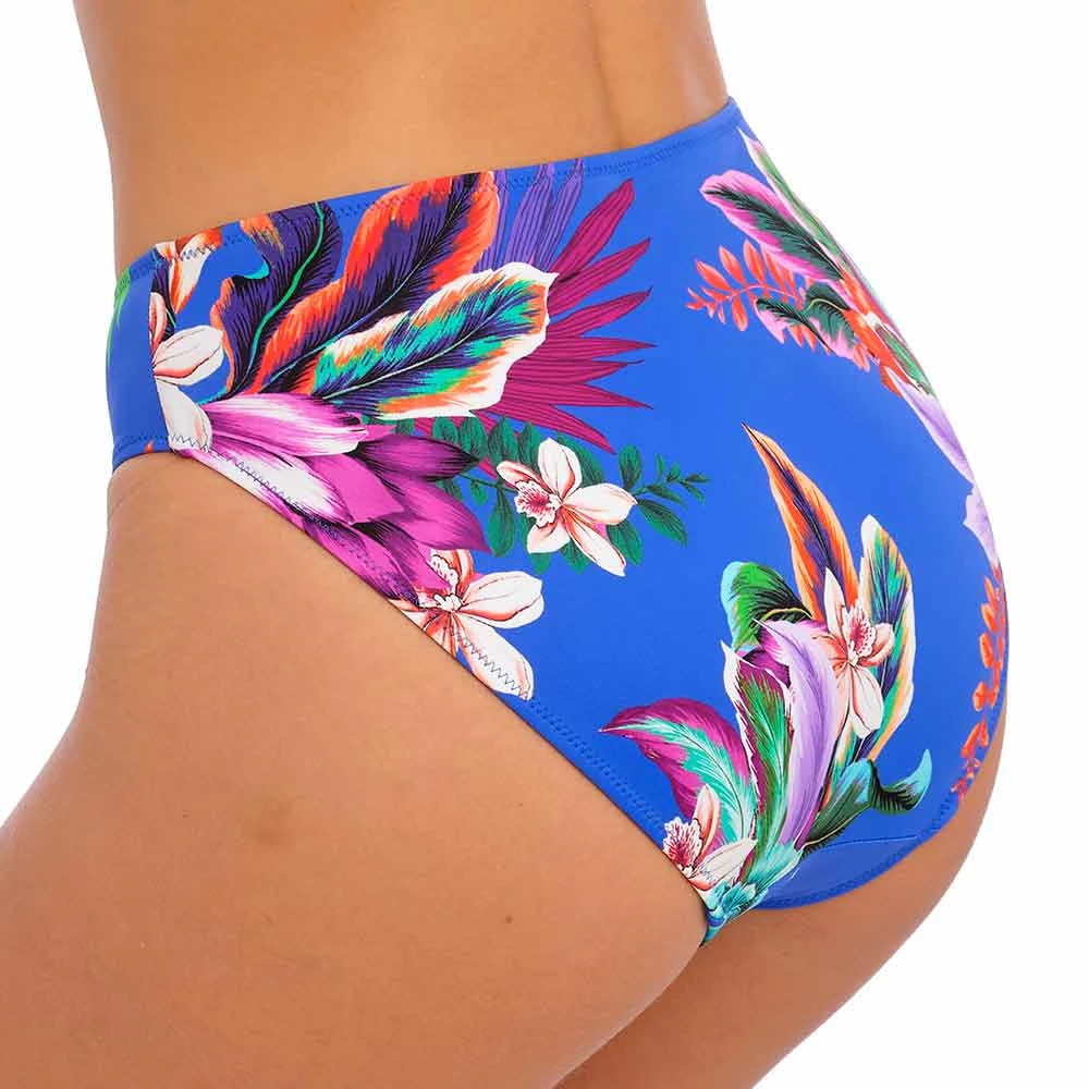 Halkidiki mid rise bikini briefs by Fantasie Swim. Medium coverage fully lined ladies bikini briefs made from soft to handle fabric. In a refreshing fuchsia pink colour decorated with floral print for a sophisticated holiday look.
