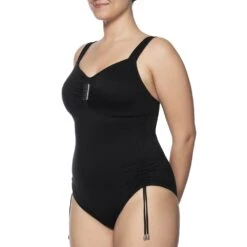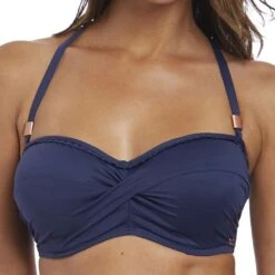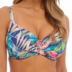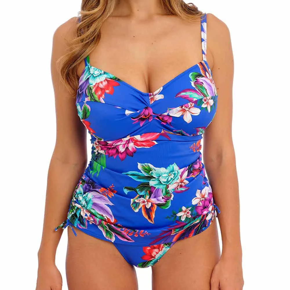 Halkidiki twist front underwired tankini top by Fantasie Swim. Underwired ladies tankini top with slightly padded foam cups for rounded shape and support. Fully lined with adjustable tie sides to customise the body length and with ruched front to flatter the tummy area. This bikini top comes with integrated bra with hook and eye fastening on the back for an extra support and control.