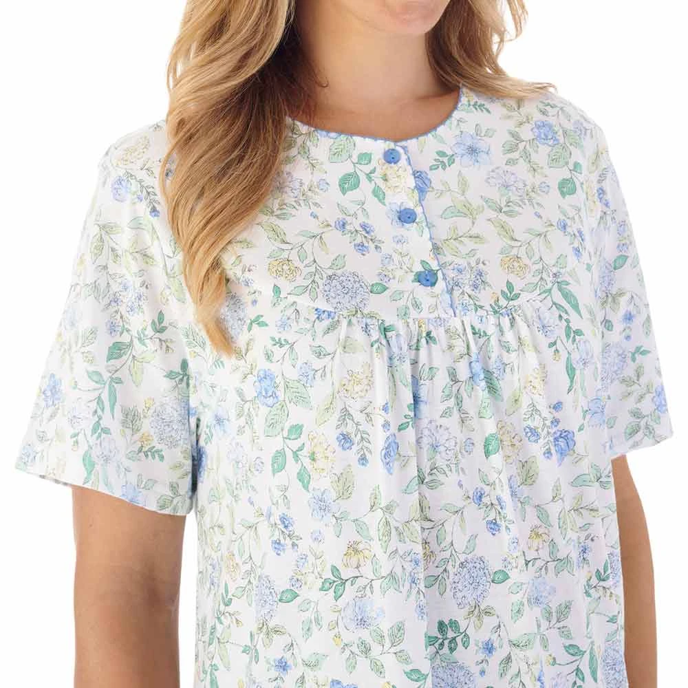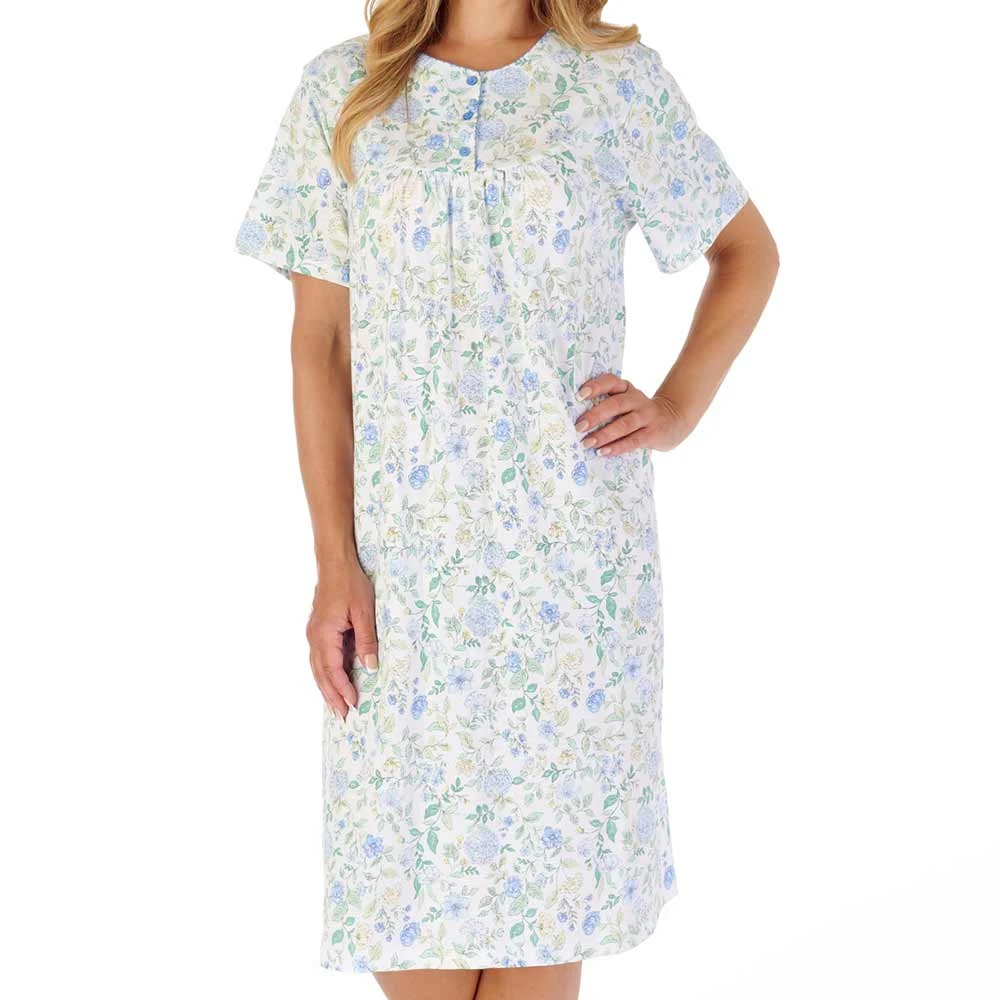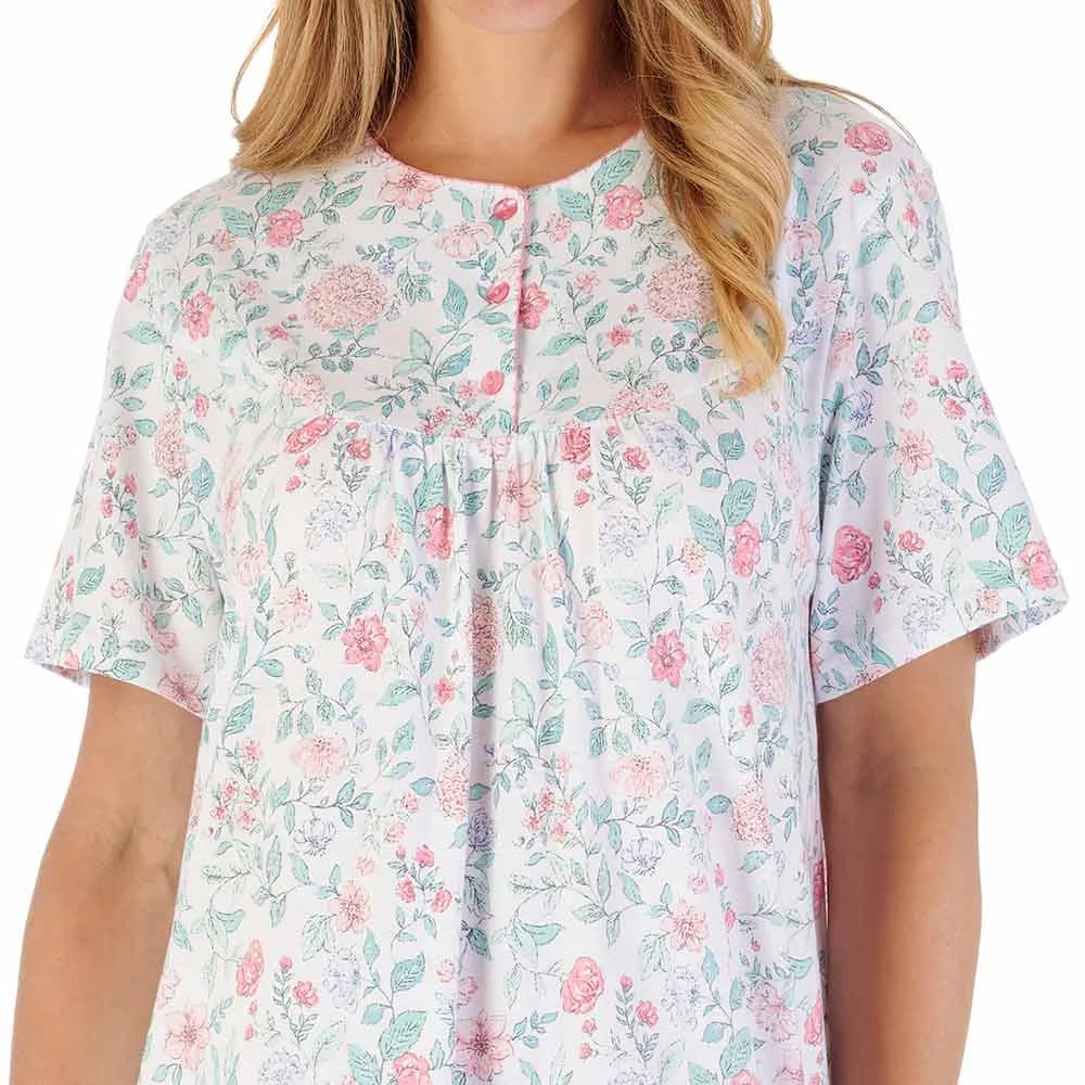 Hedgerow Flowers Short Sleeve 42 inch Cotton Nightdress by Slenderella. Pretty ladies nightdress made from soft cotton jersey fabric to keep you cool at warmer months. The material is breathable with all over floral print for comfort and a feminine look. In a classic shape this summer nightdress is finished with buttoned top for an ease of dressing.