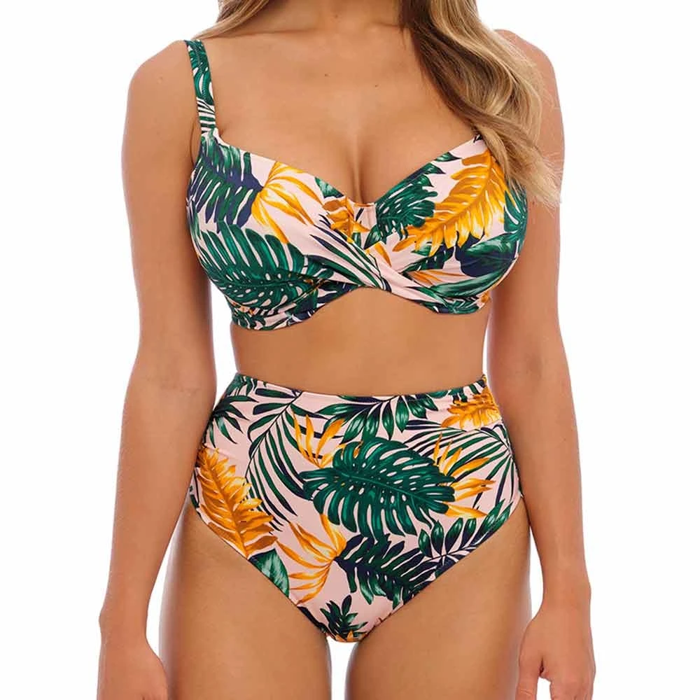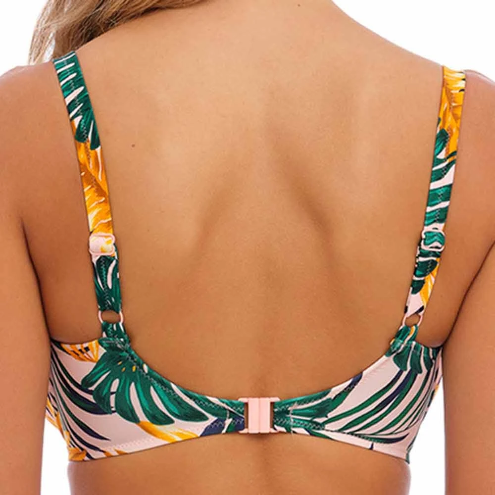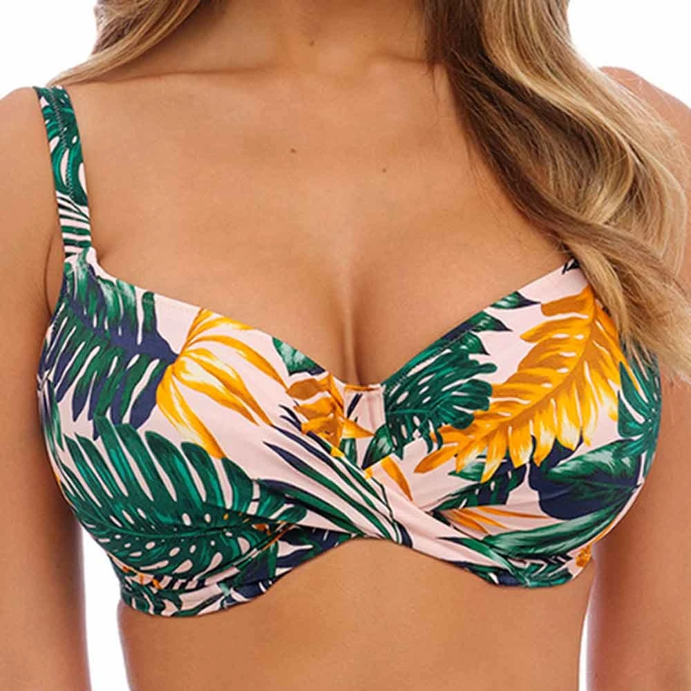 Jungle falls underwired full cup bikini top by Fantasie Swim. Fully lined full coverage bikini top with wrap over front to flatter the bust shape. With fully adjustable straps and powernet lined wings for better support.