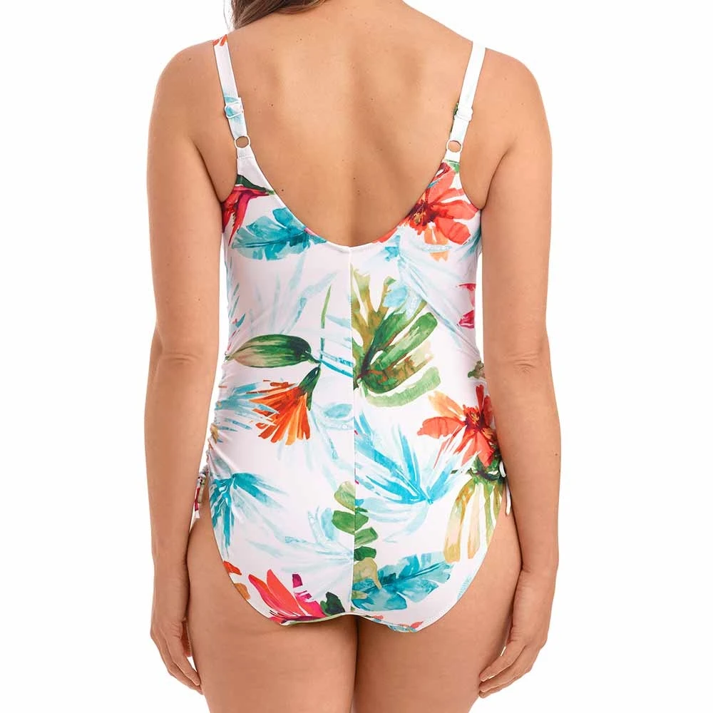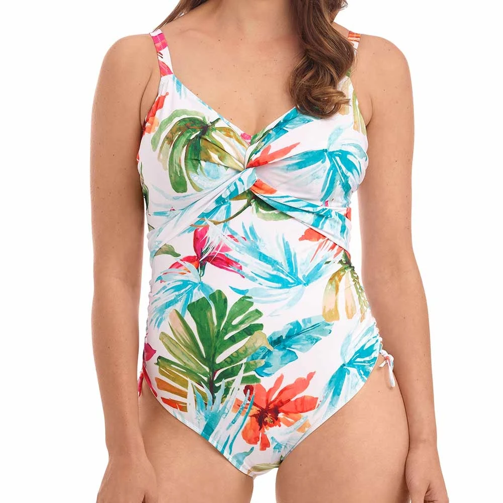 Kiawah Island Swimsuit by Fantasie Swim. Fashionable underwired ladies swimming costume in a refreshing watercolour print on a white base. With adjustable side legs to customise the body length and twist front for a flattering effect. Features fully adjustable straps and a scoop back for an ease of wear.