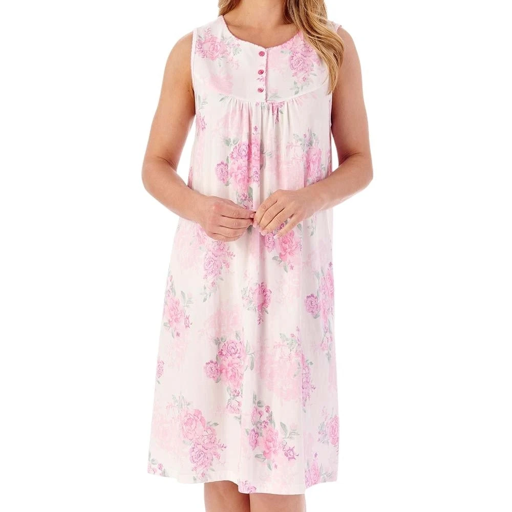 Large Floral Sleeveless 40 Inch Cotton Nightdress by Slenderella. All over floral print classic ladies nightdress made from lightweight pure jersey cotton fabric perfect for summer nights. With button opening top and slightly gathered yoke for an ease of wear.