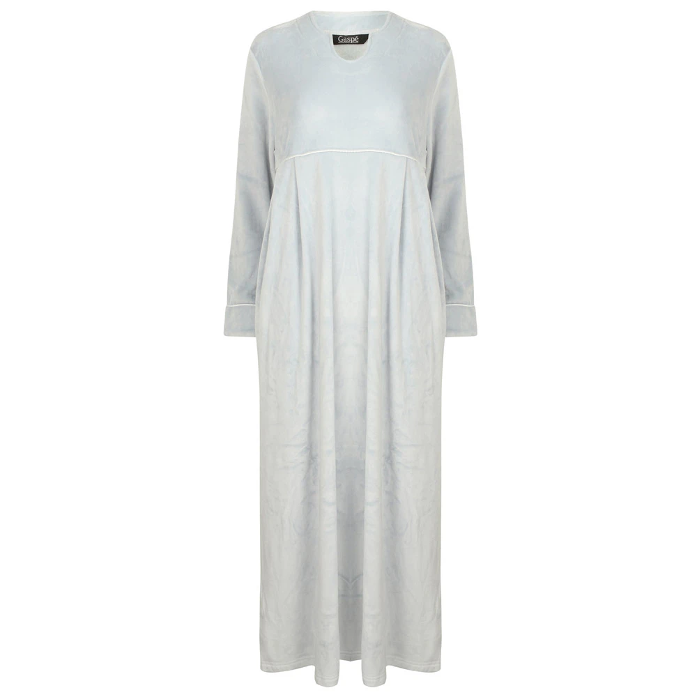Long length kaftan housecoat by Gaspe. Made from thick and warm velour fabric perfect for colder weather. This loose fit floor length dressing gown features a shaped neckline and a slight A-line shape for great comfort to wear at winter evenings and nights. With two hidden practical pockets is ideal as an elegant loungewear. Suitable for fuller figure and taller ladies.