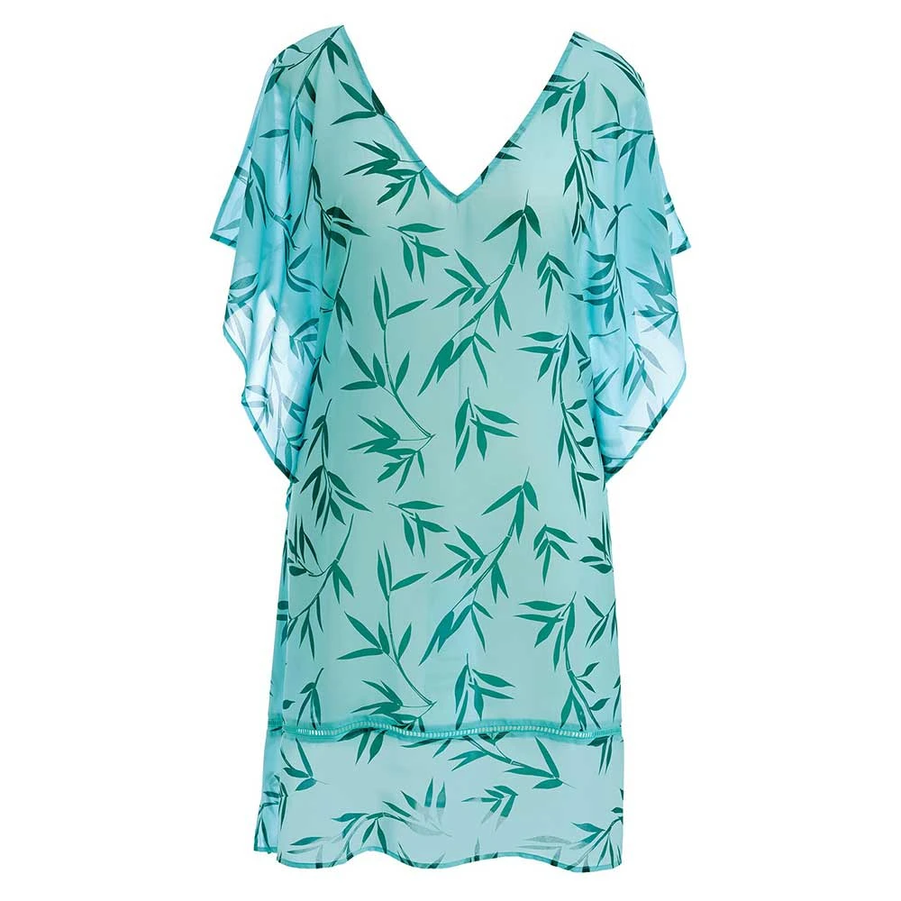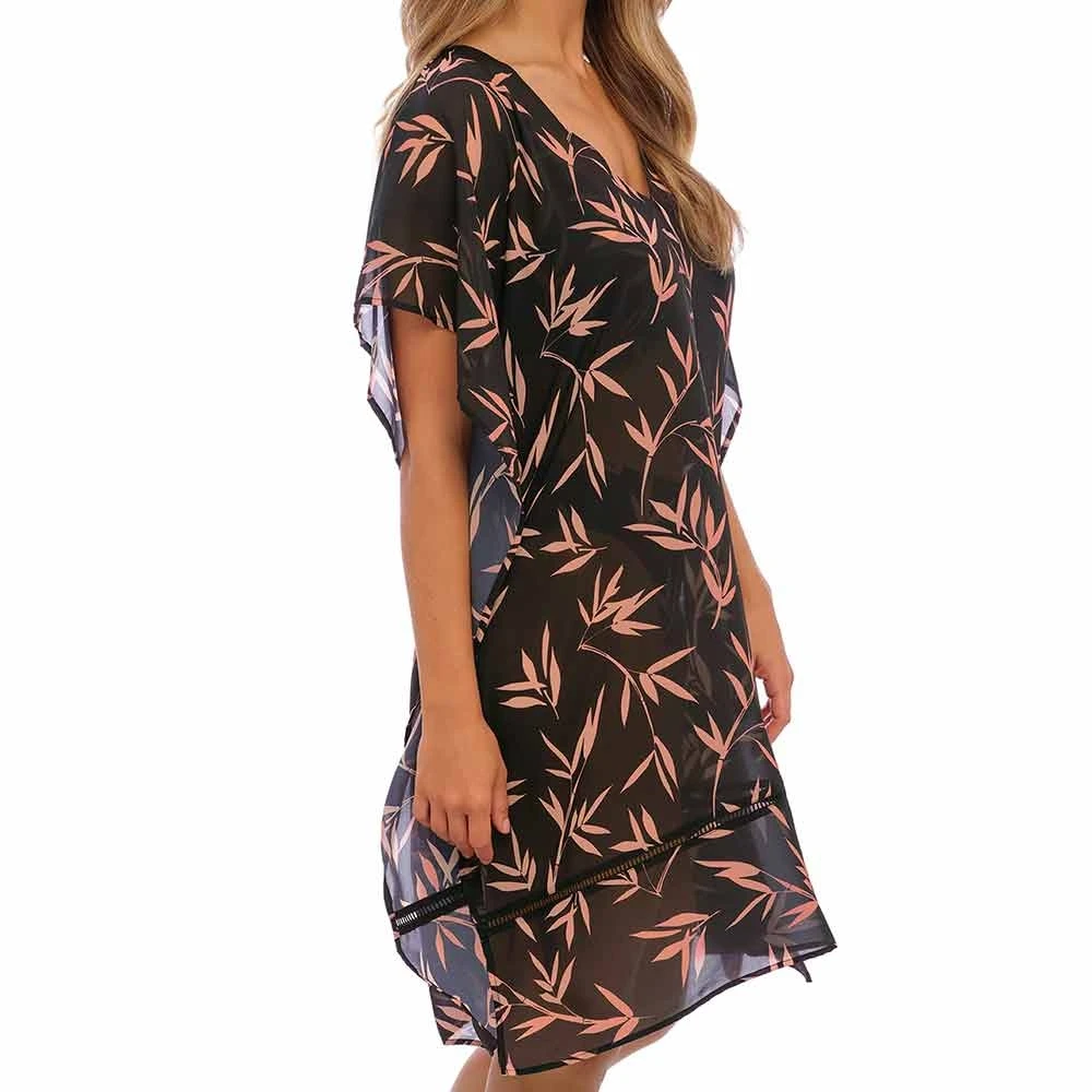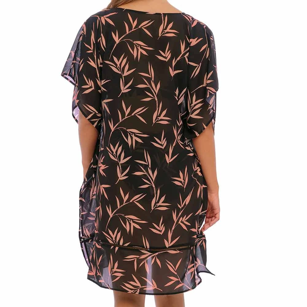 Luna Bay Kaftan Beach Cover by Fantasie Swim. Loos fit v-neck swimwear cover made from soft and fine fabric for hot holiday weather. With open sides and black ladder stitch detail for a fashionable look.