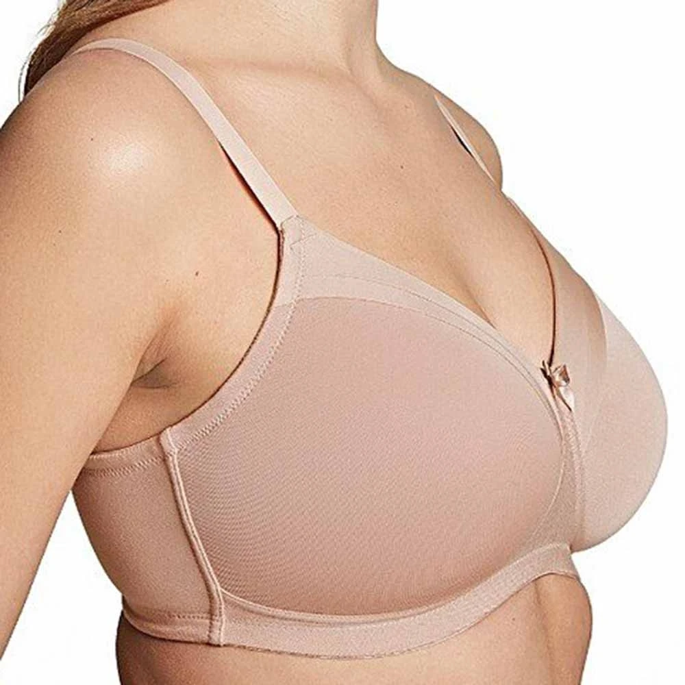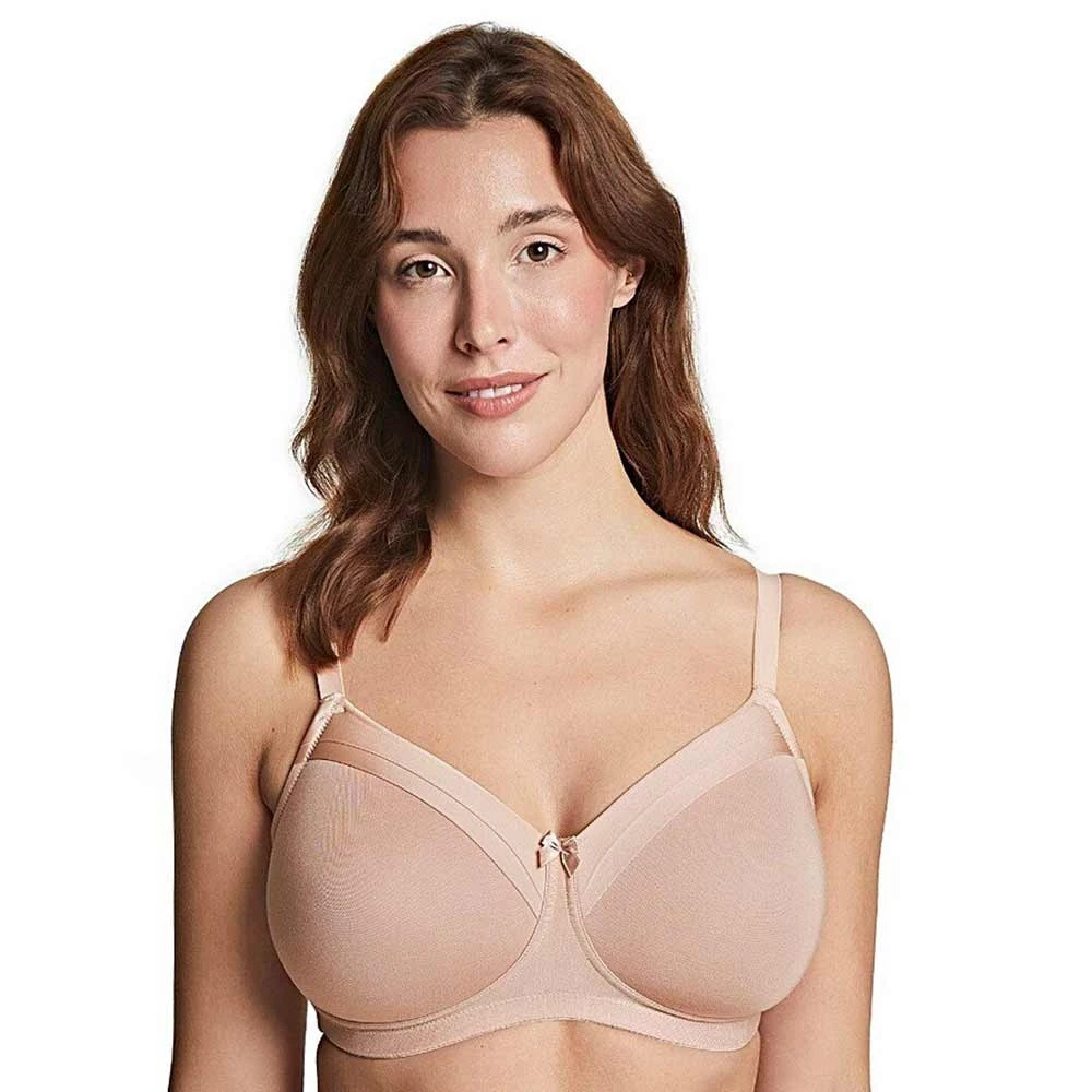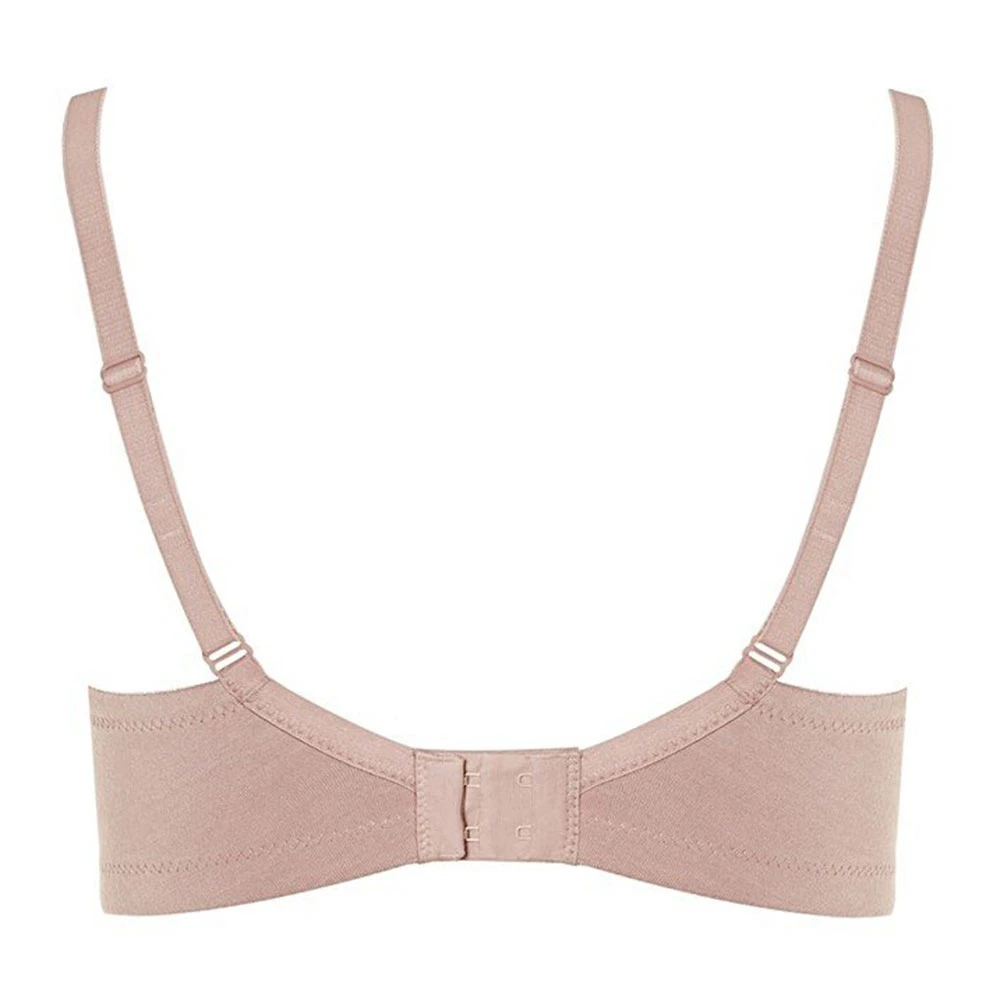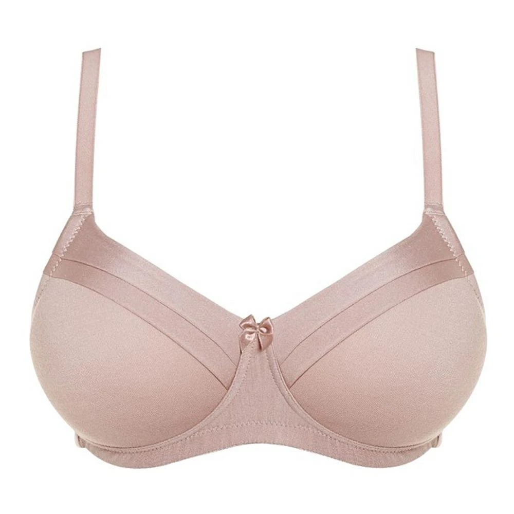 Maisie soft cup t-shirt bra by Royce Lingerie. Everyday wirefree bra made from soft modal blend moulded fabric for a smooth seamless look under clothes. Decorated with satin trim on the top cup for a feminine look. Features cotton lining inside cups which can be use to hold prosthesis if required.