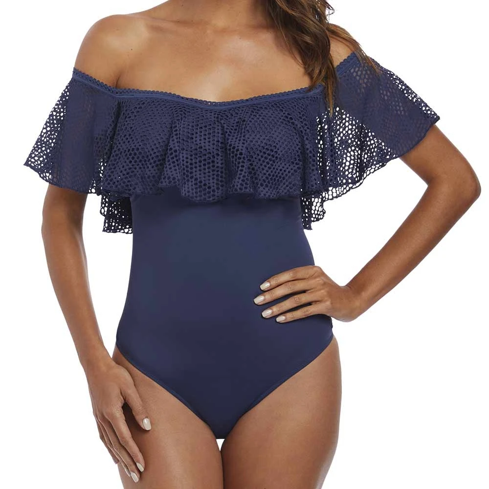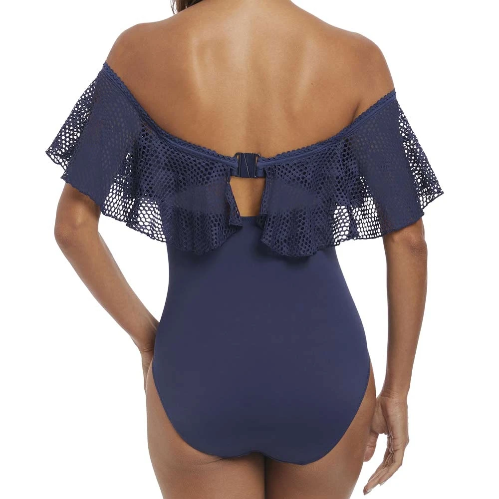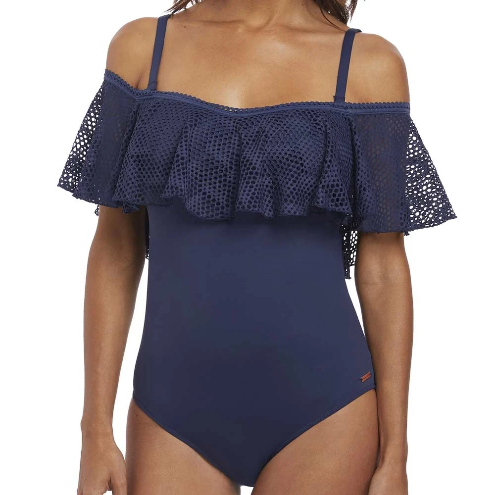Marseille underwired bardot swimsuit by Fantasie Swim. Sophisticated and ultra feminine swimming costume with crochet waterfall loose overlay. With detachable multiway straps cane be worn off or on the shoulders. Comes with envelope open back and wide clasp for a great support and an ease of wear.