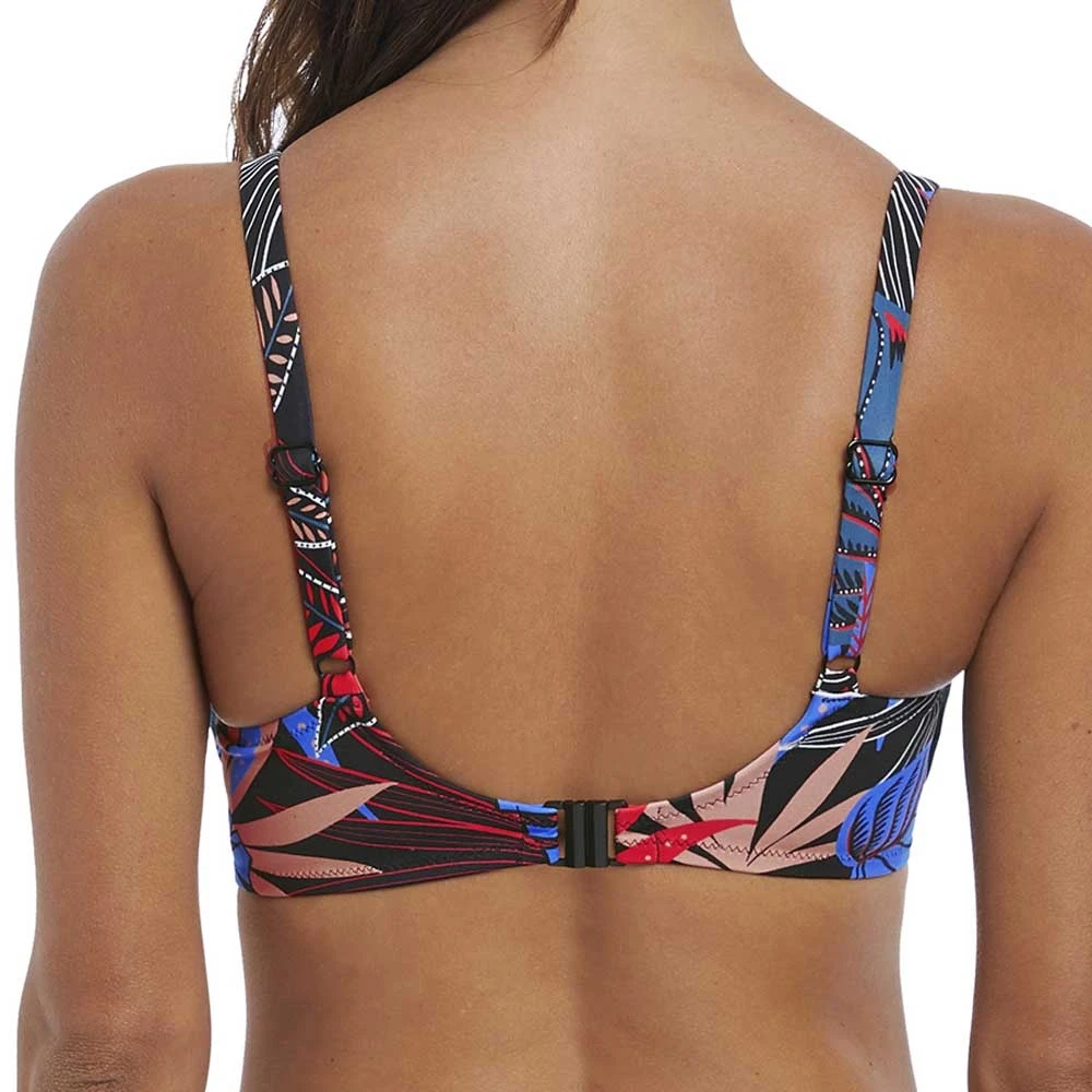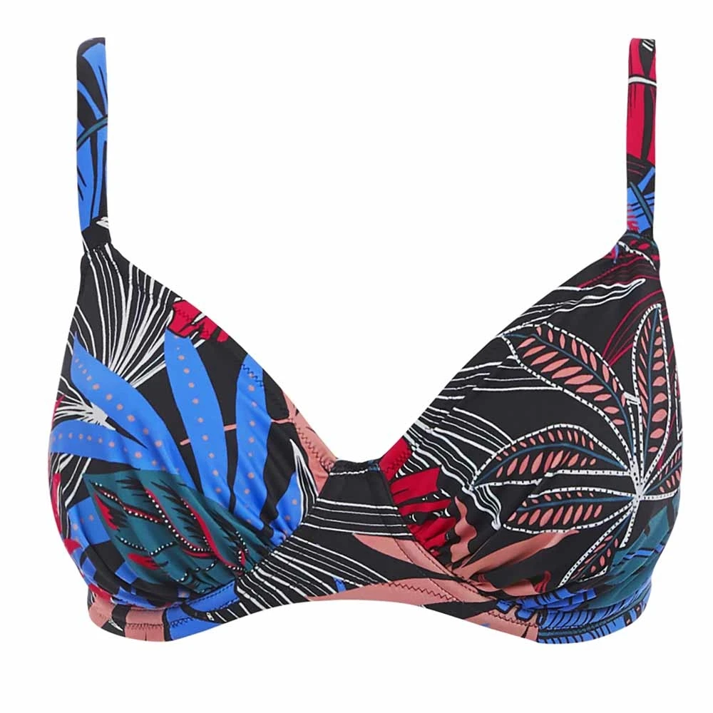 Monte Cristi full cup bikini top by Fantasie Swim. Underwired fully lined bikini top with hidden side panel for an extra support for fuller bust. The cups are non padded and slightly gathered to flatter all bust shapes. Monte Cristi is a mix and match collection in a vibrant exotic print and is a must have for this season. Shop our collection now, it’s on currently offer and selling fast.