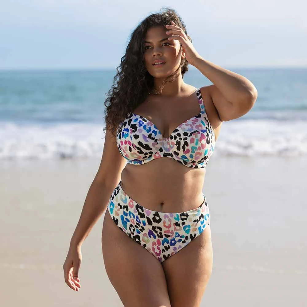 Party Bay Underwired Plunge Bikini Top by Elomi Swimwear. Fuller bust fully lined bikini in a colourful leopard print for a fashionable holiday look. The shape of the bikini top is based on the Elomi Lingerie bras. The lining comes with side support panel for a great shape and support. Fully adjustable straps and wide clasp fastening to add to the support.