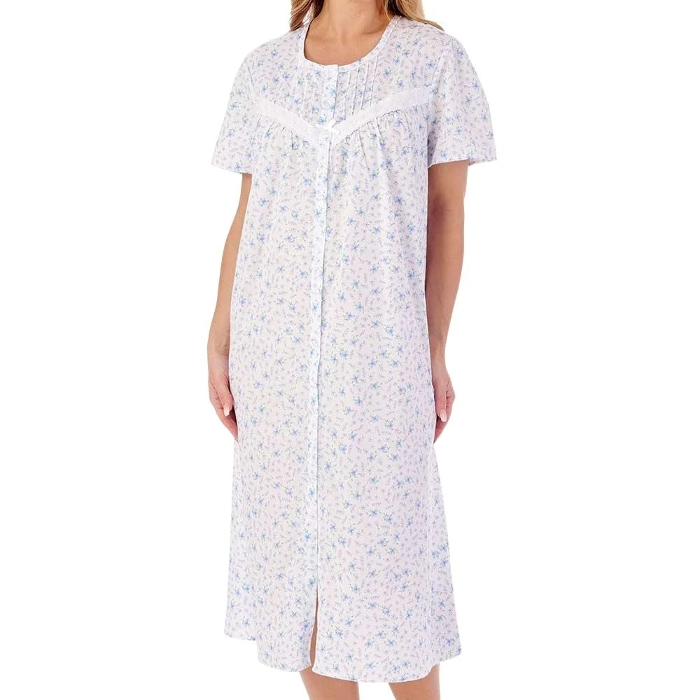 Periwinkle Short Sleeve Button Through 46 inch Cotton Nightdress by Slenderella. Classic ladies nightdress made from lightweight woven cotton, perfect for warmer nights. With button through front opening for an ease of dressing and broderie trim to the yoke and neck to add to the look.