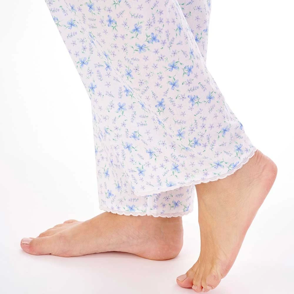 Periwinkle short sleeve buttoned top pyjama set by Slenderella. Classic tailored style ladies pyjamas made from lightweight woven cotton for warmer spring and summer nights. With full length straight trousers and short sleeve top in a wildflower all over print. Chest pocket and sleeve edges are finished with delicate lace trim for a feminine look.