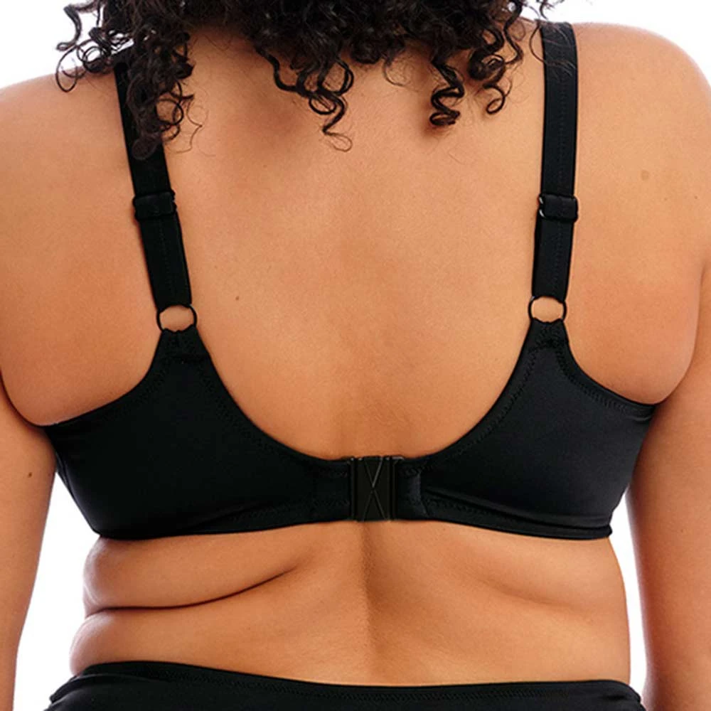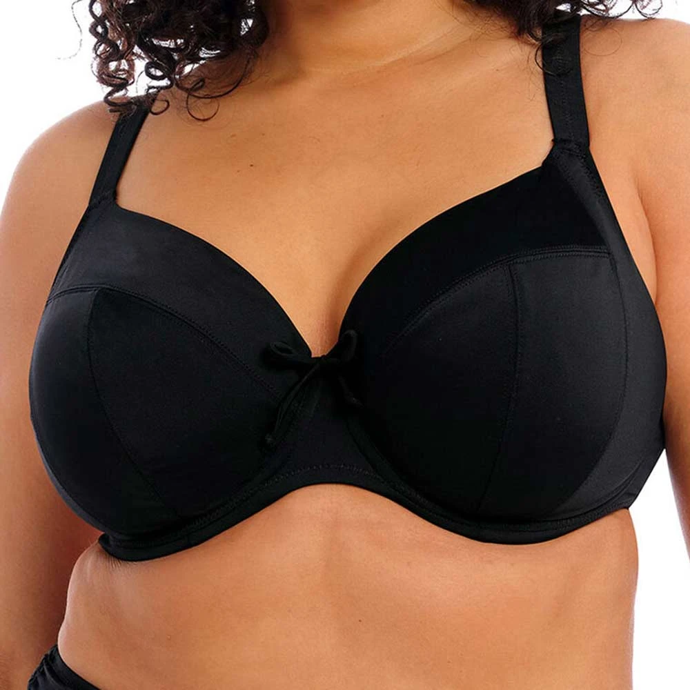Plain Sailing Underwired Plunge Bikini Top by Elomi Swimwear. Classic and plain fuller bust bikini top made from lightweight fabric with supportive lining for the same shape as in Elomi bras. With lower centre front for a plunge look and fully adjustable straps for a customised fit.