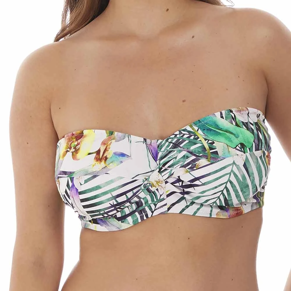 Playa Blanca twist front underwired bandeau bikini top by Fantasie Swimwear. Strapless bikini top with detachable scarf tie for an elegant touch. Comes with lightly padded cups and side bones for support. Finished with twist front detail to the front to flatter the bust shape. In a sophisticated tropical print for fashionable look. It’s your last change to try the matching set, grab a bargain while stocks last.