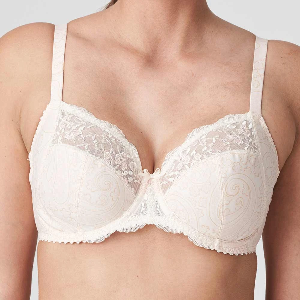 Gythia Underwired Full Cup Bra by PrimaDonna. Stunning full coverage bra with an excellent side support for forward projection. With firm, non stretchy bottom cup and side panels, and floral embroidered tulle on the top cup for a lighter look. In a refreshing light colourway perfect for summer wear. ***If you are unfamiliar with PrimaDonna brand please go up a size***