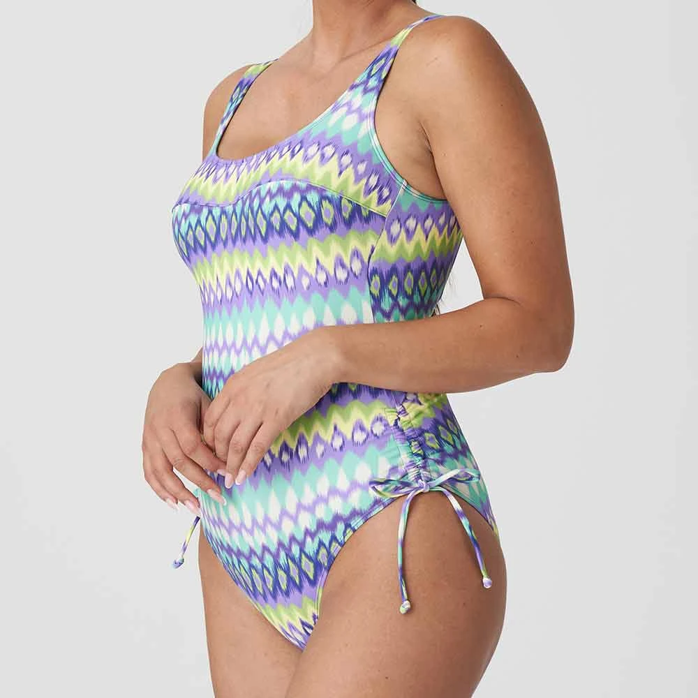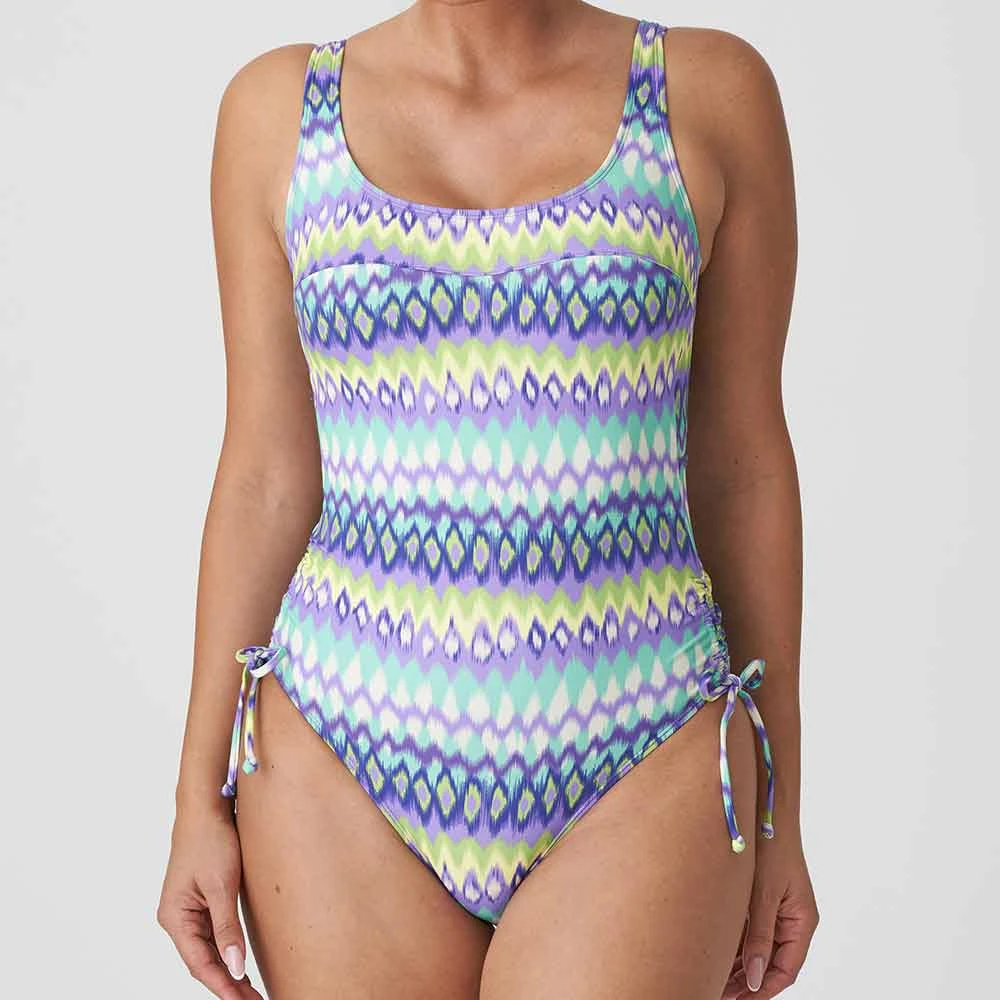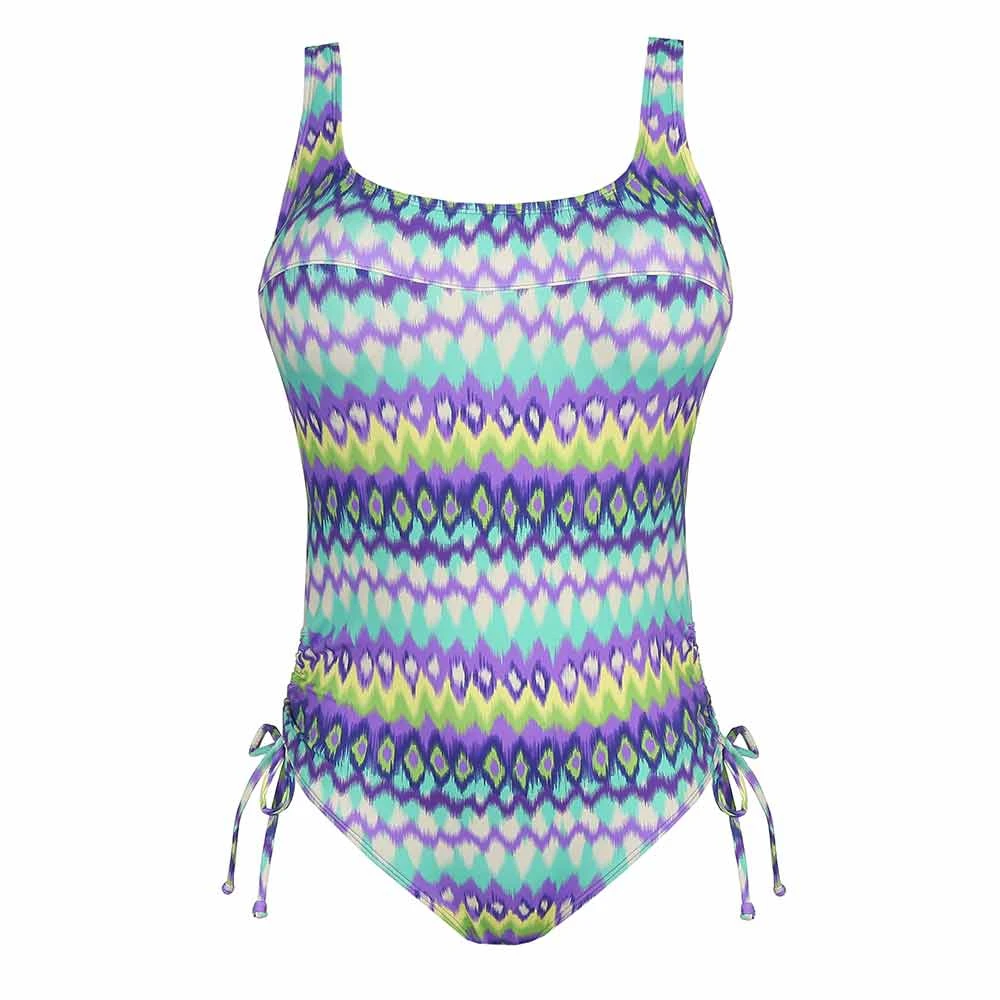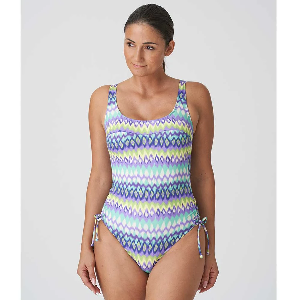 Holiday Wirefree Swimsuit by PrimaDonna. Classic shape ladies swimming costume with soft cup and removable pads for a great bust shape. With low back for an ease of wear and adjustable tie sides for customised leg coverage.