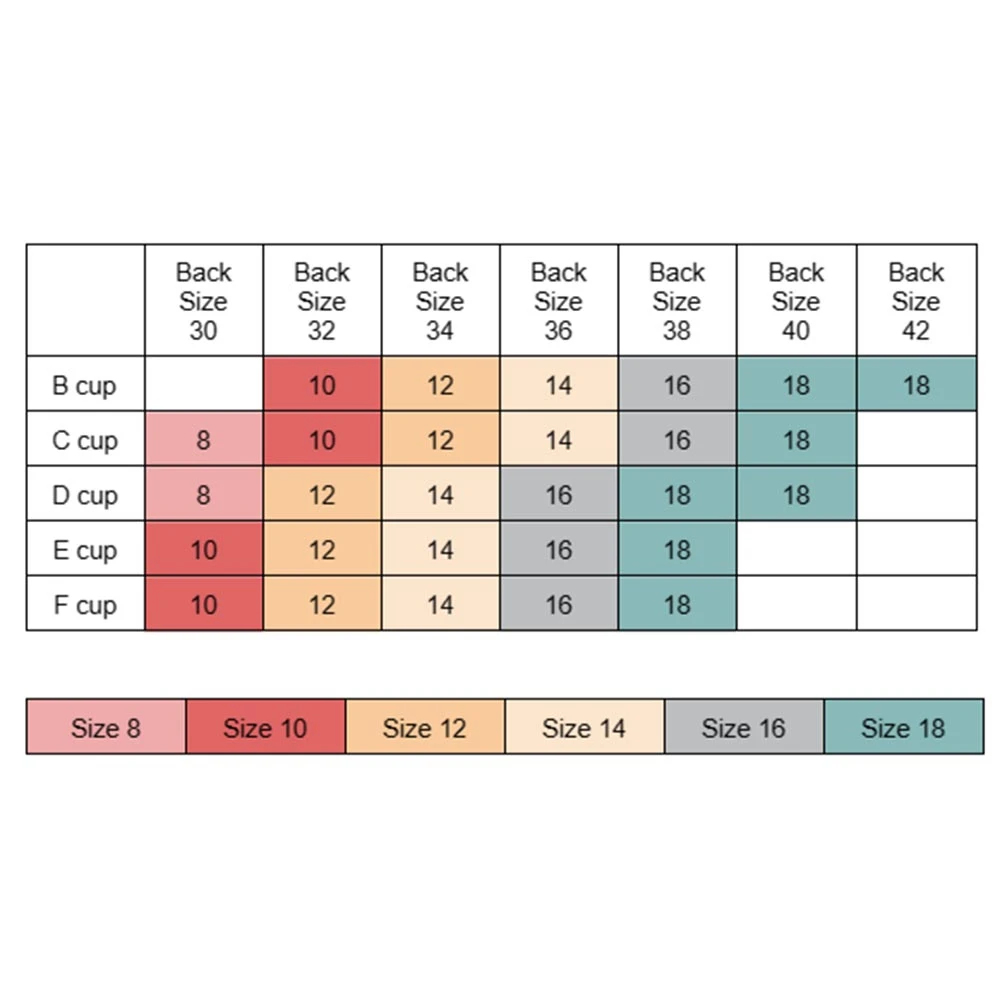 Sizes: 8-XS 10-S 12-M 14-L 16-XL 18-2XL, Soft cups with removable pads, Adjustable leg sides, Classic shape, Non-adjustable straps, Low back