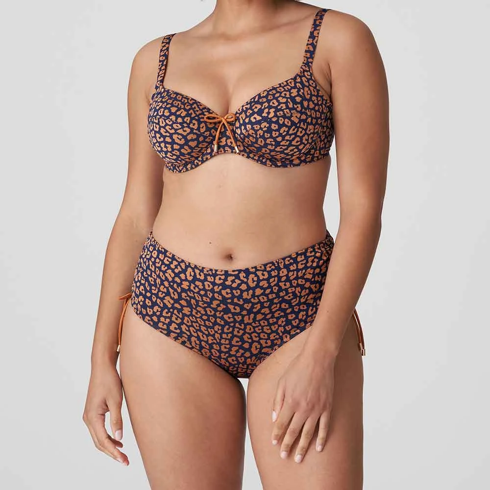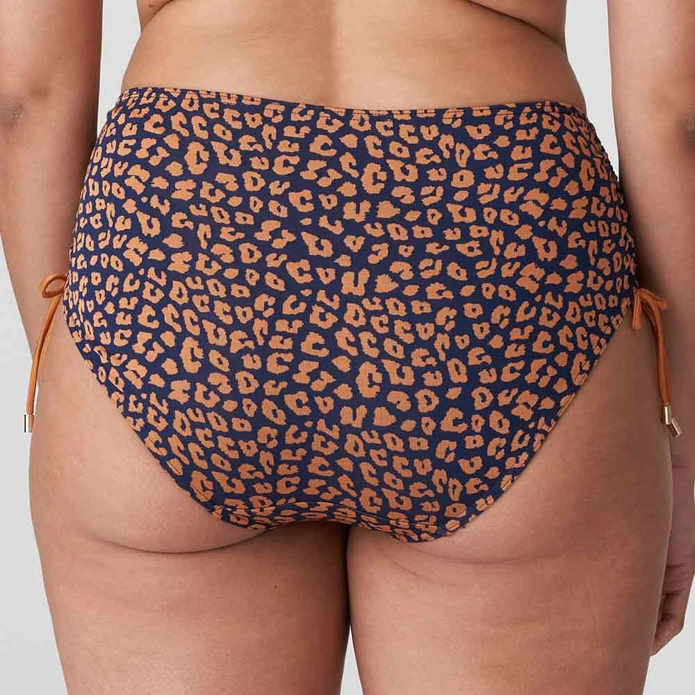 Punta Rata Adjustable Leg Full Bikini Briefs by PrimaDonna. Fully lined ladies bikini bottoms in a trendy animal print on a dark blue base. Full coverage high waist style with adjustable sides for customised leg coverage. Made from fashionable jacquard texture fabric.