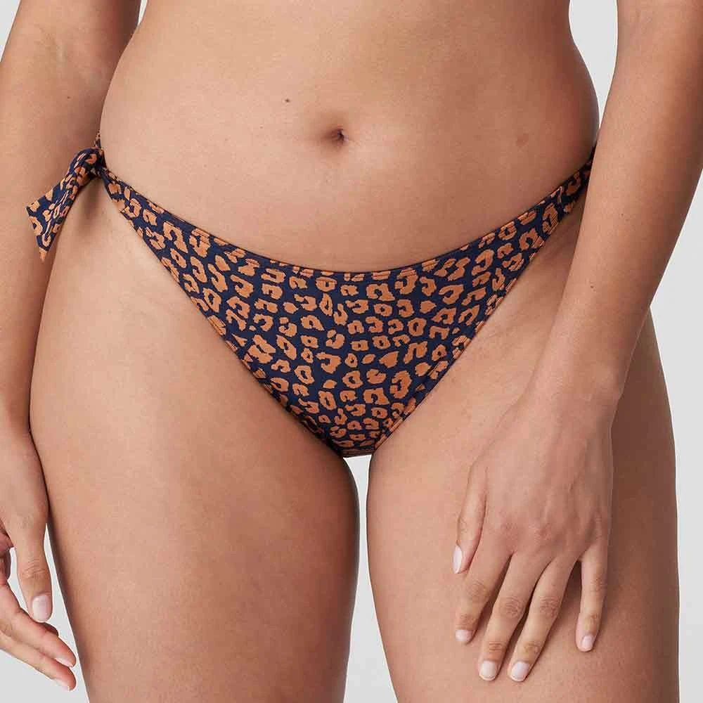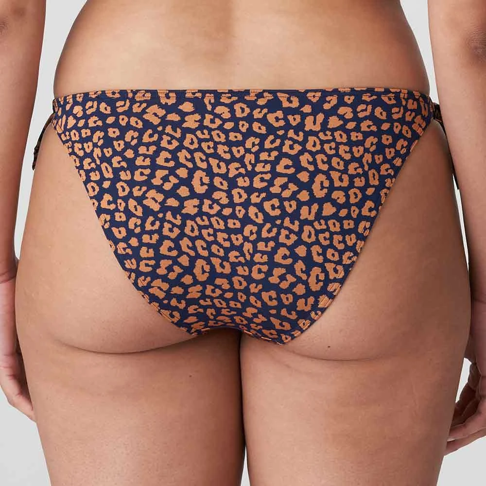 Punta Rata Tie Sides Bikini Briefs by PrimaDonna Swim. Hipster style ladies bikini bottoms with trendy side ties for less coverage. In a fashionable brown print on a dark blue background. Perfect for this season holiday.