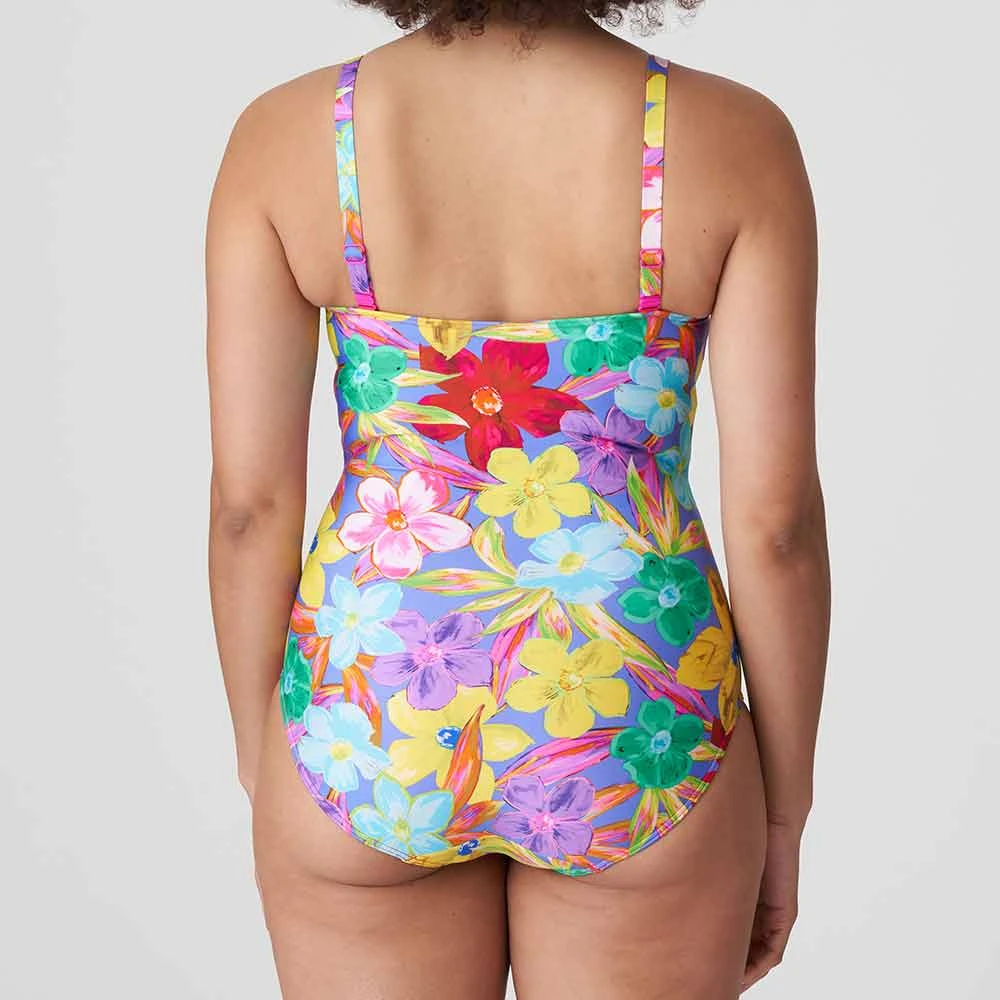 Sazan Underwired Multiway Firm Control Swimsuit by PrimaDonna. Trendy, shaping swimming costume in a bright floral pattern perfect for holiday wear. With multiway fully adjustable straps can be worn as halter neck to create your own look. The strong powernet lining will provide extra firm tummy control to shape the silhouette and the lightly gathered front panel will hide any imperfections. This is a perfect shape to hide belly pooch. Available up to an I cup. If you never tried PrimaDonna swimwear before we would recommend to go up in the size.