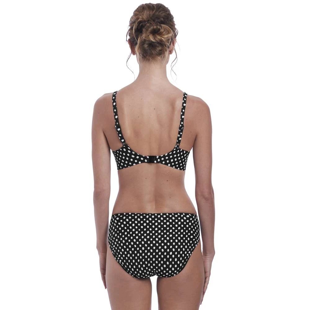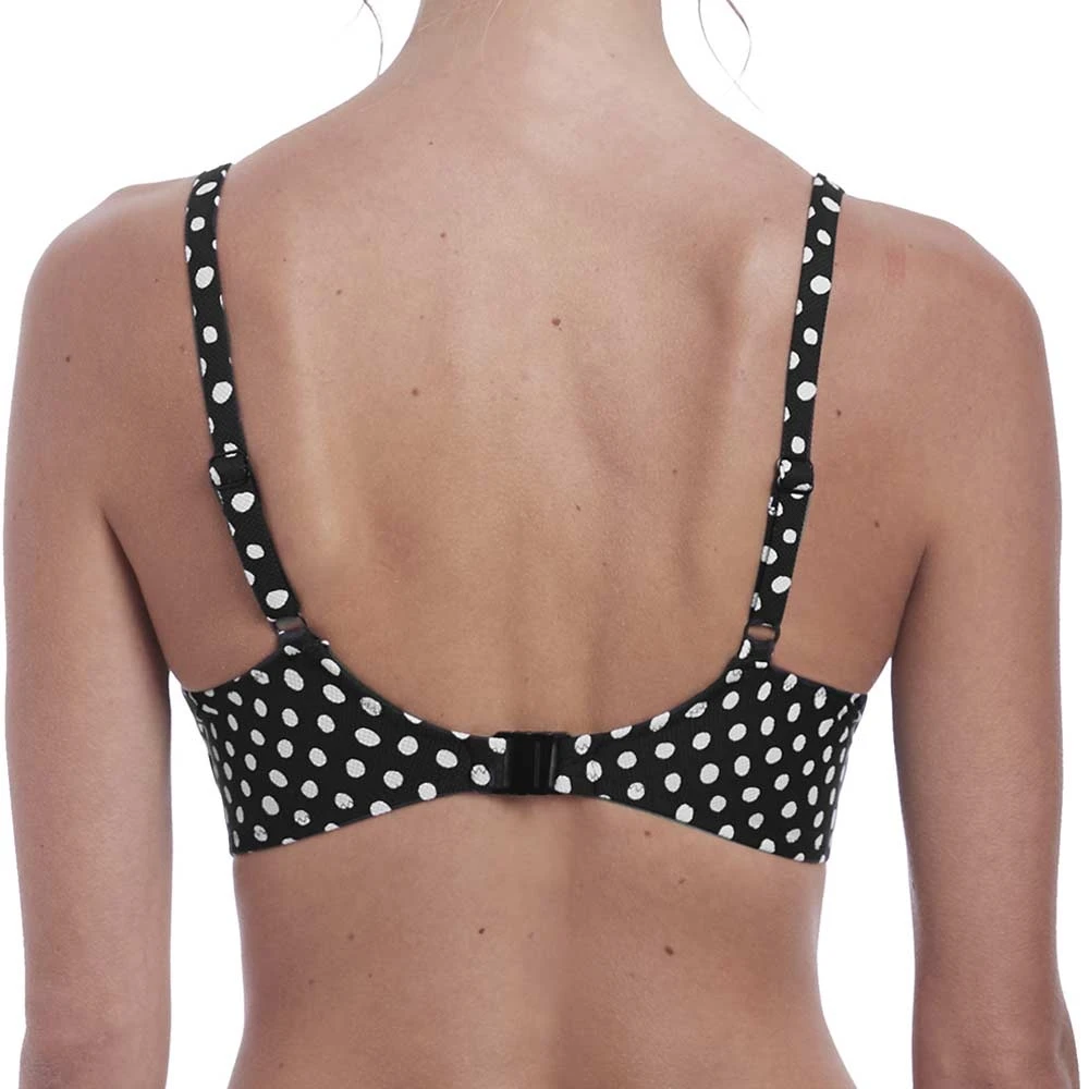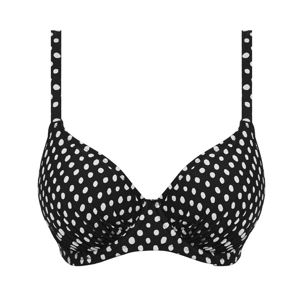 Santa Monica bikini top by Fantasie Swimwear. Comes with underwired, fully lined full coverage cups with great support for fuller bust up to J cup. The cups are slightly gathered to flatter all bust shapes. Features fully adjustable straps and powernet lining to the back for a smooth finish. Santa Monica is a monochrome classic collection made from a textured fabric with white spot print for a modern look.