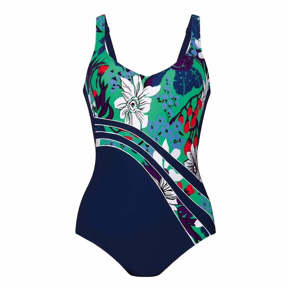 Spring Florals Luella Soft Cup Swimsuit by Anita Comfort. Wire free v-neck shaping swimming costume with strong front lining for medium support tummy control. With contrasting front panel printed with refreshing leaves and flowers for a trendy look. Features adjustable straps and round back for comfort.
