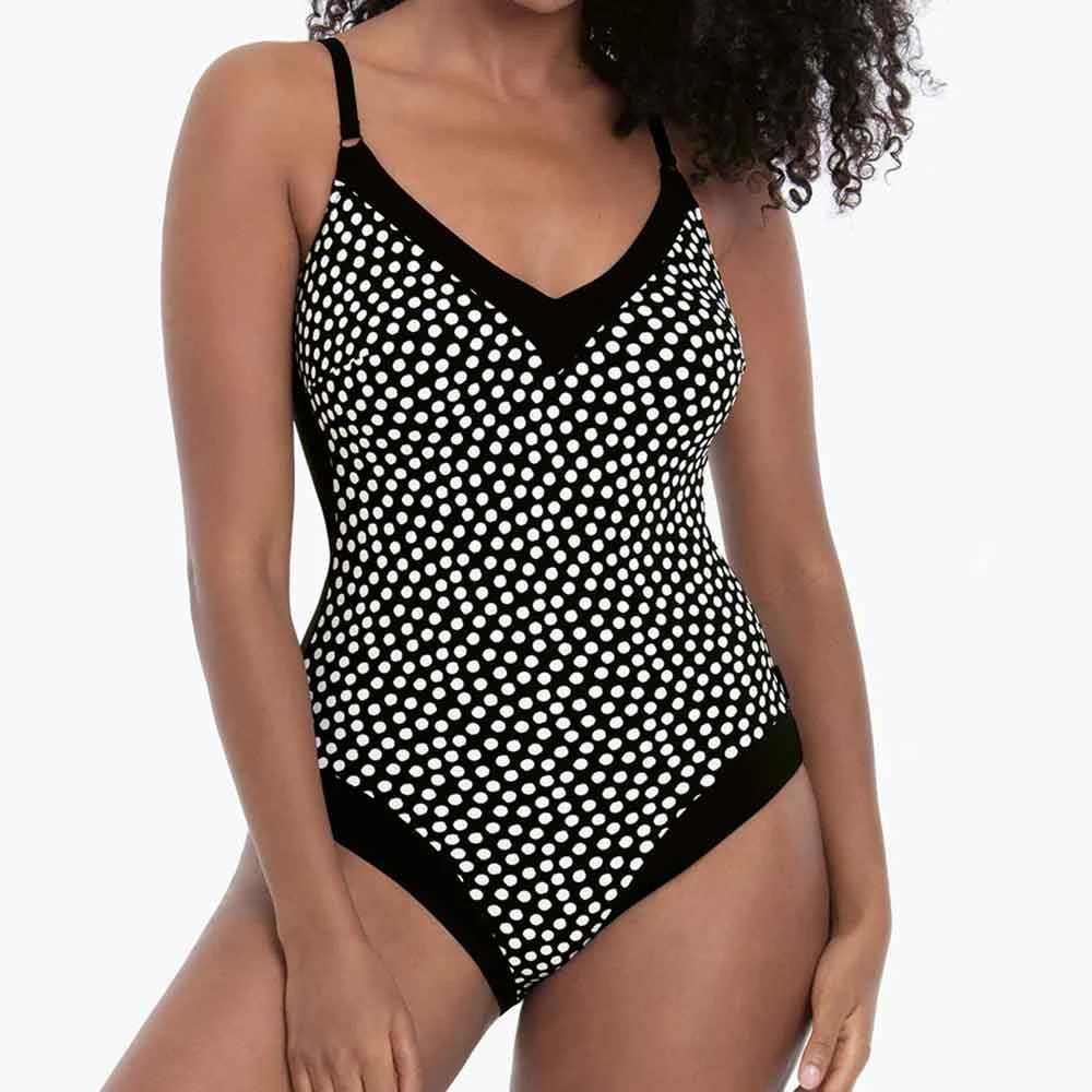 Summer Dot Mabela Soft Cup Swimsuit by Anita Rosa Faia. Classic shape swimming costume in a trendy polka dot print. With wirefree moulded cups for a great shape and strong powernet lining to shape and smooth the silhouette