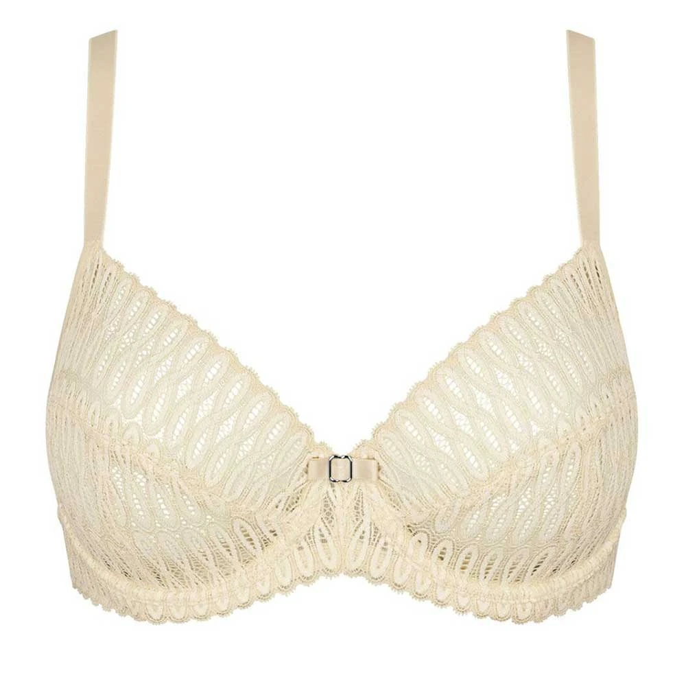 Aura Spotlight Underwired Bra by Triumph Lingerie. Three section, underwired cup bra with lower centre to fit under low-cut clothes. Made from soft, flat lace providing natural look shape without padding.